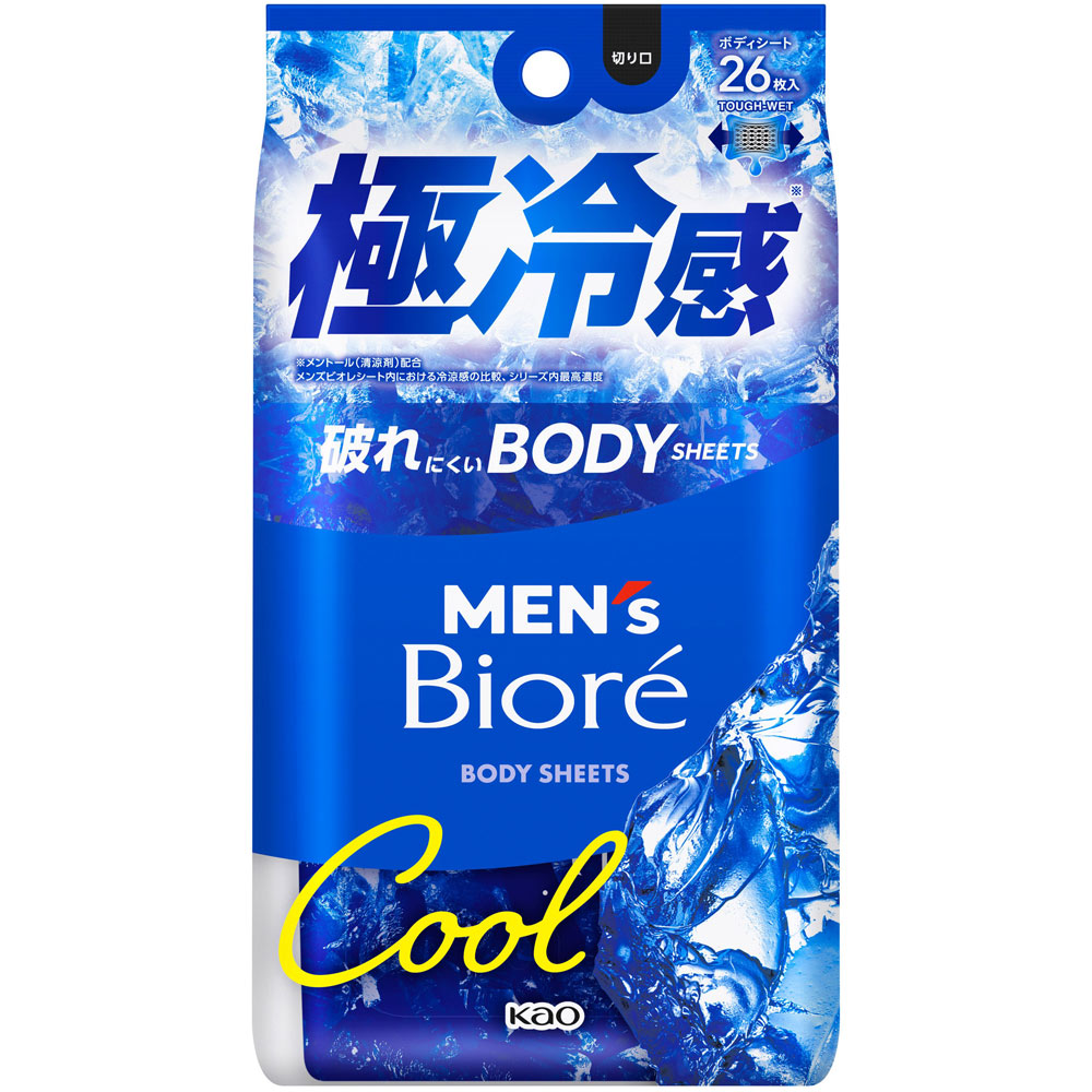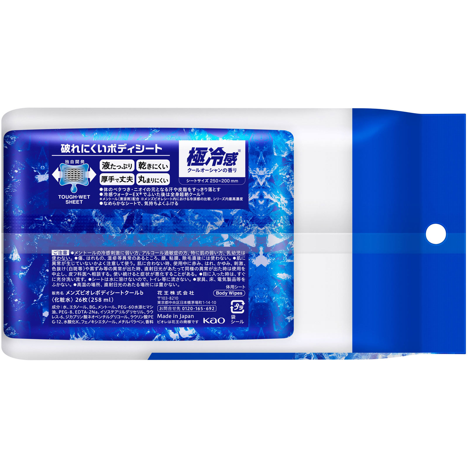 破れにくいボディシート独自開発TOUGH-WET SHEET液たっぷり 乾きにくい 厚手で丈夫 丸まりにくいクールオーシャンの香りシートサイズ250×200mm●体のベタつき・ニオイの元となる汗や皮脂をすっきり落とす●冷感ウォーターEX*でふいた後は全身超絶クール※*メントール(清涼剤)配合※メンズビオレシート内における冷涼感の比較、シリーズ内最高濃度●なめらかなシートで、気持ちよくふける