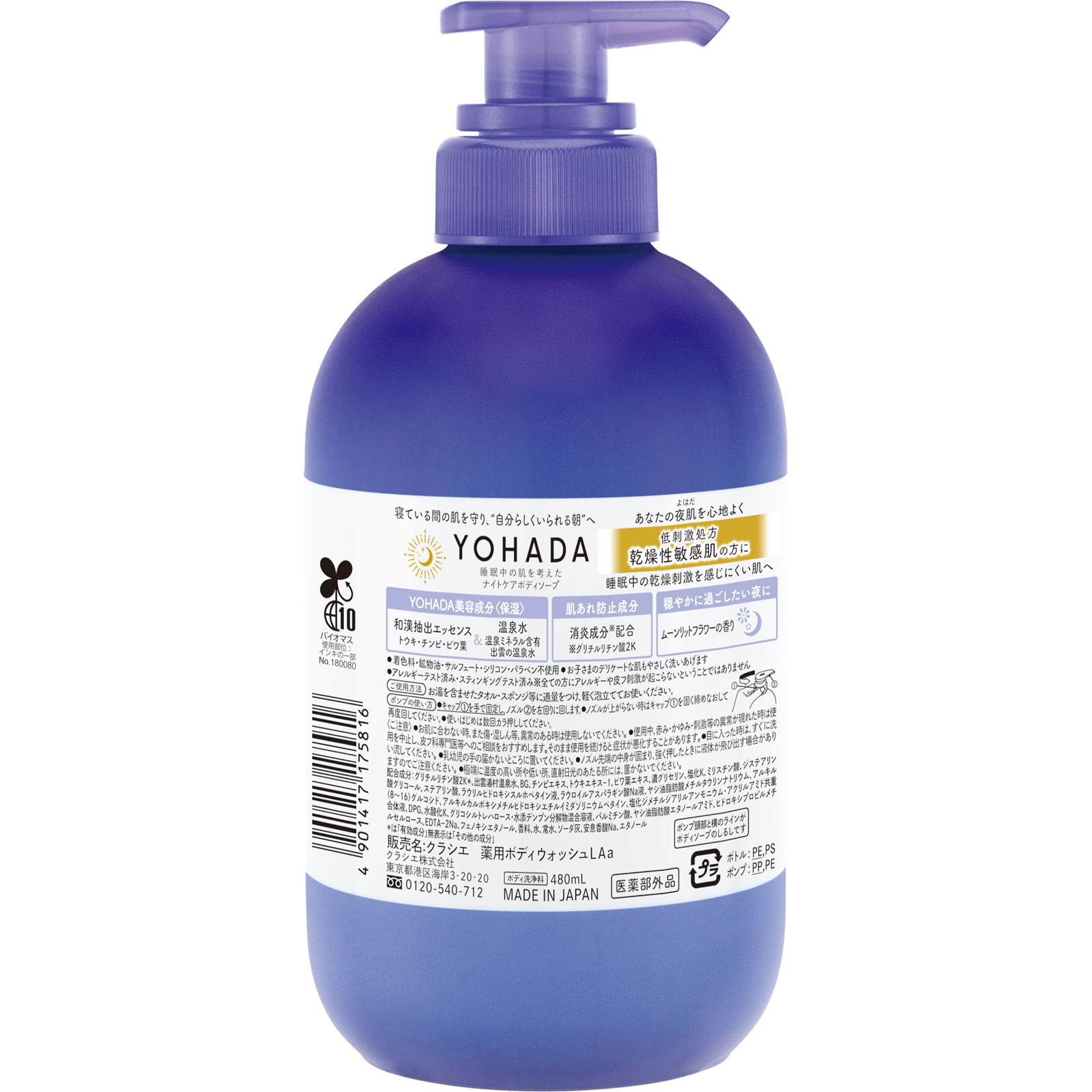 睡眠中の肌を守りカサカサが気にならない肌へ和漢&温泉水配合寝ている間の肌を守り、“自分らしくいられる朝”へ睡眠中の肌を考えたナイトケアボディソープあなたの夜肌を心地よく低刺激処方 乾燥性敏感肌の方に睡眠中の乾燥刺激を感じにくい肌へ○YOHADA美容成分〈保湿〉和漢抽出エッセンス トウキ・チンピ・ビワ葉&温泉水 温泉ミネラル含有 出雲の温泉水○肌あれ防止成分消炎成分※配合※グリチルリチン酸2K○穏やかに過ごしたい夜にムーンリットフラワーの香り●着色料・鉱物油・サルフェート・シリコン・パラベン不使用●お子さまのデリケートな肌もやさしく洗いあげます●アレルギーテスト済み・スティンギングテスト済み※全ての方にアレルギーや皮フ刺激が起こらないということではありません