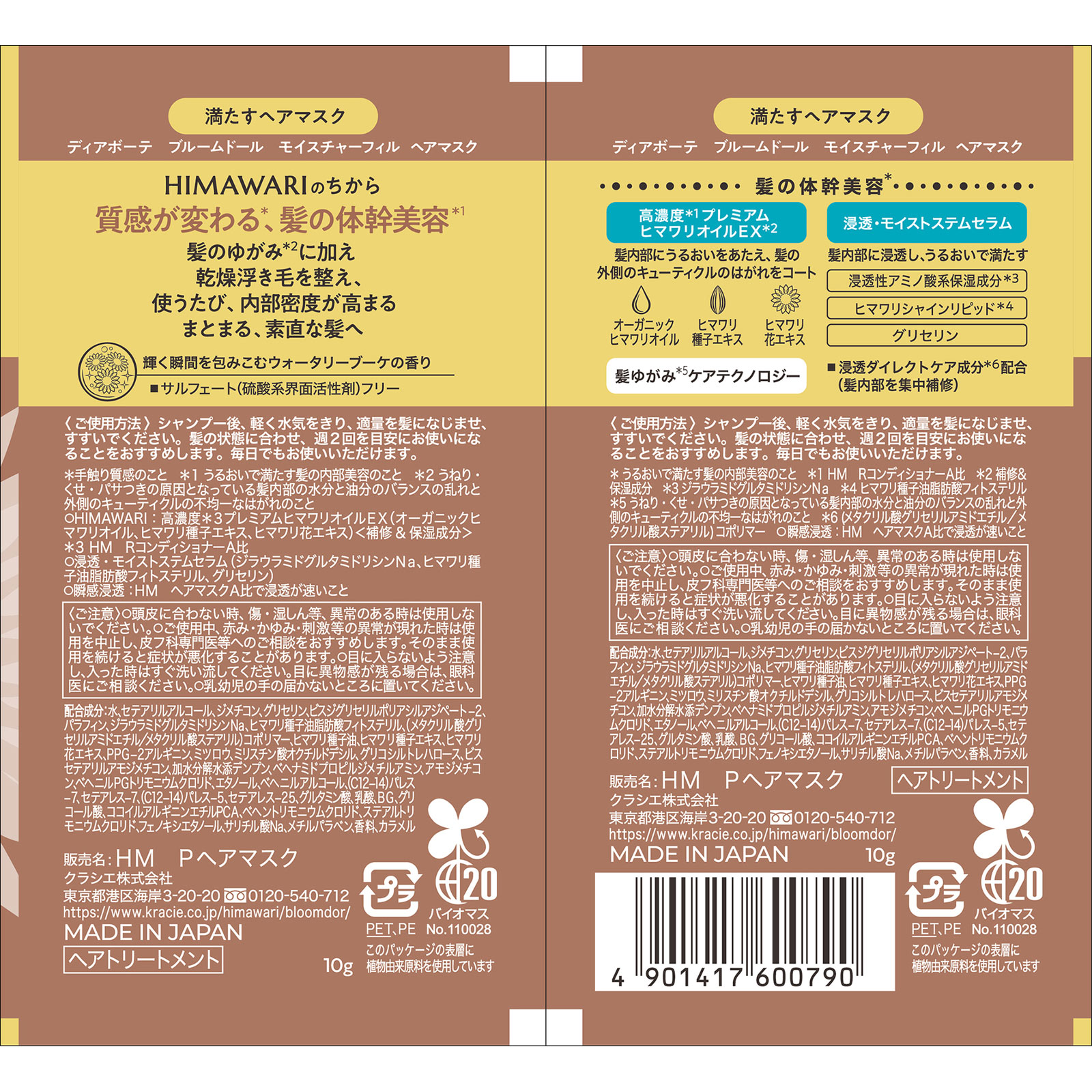 うねり くせ 乾燥浮き毛瞬感浸透 満たし、素直な髪へすぐにすすいでOK満たすヘアマスクHIMAWARIのちから質感が変わる*、髪の体幹美容*1髪のゆがみ*2に加え乾燥浮き毛を整え、使うたび、内部密度が高まる まとまる、素直な髪へ輝く瞬間を包みこむウォータリーブーケの香り■サルフェート(硫酸系界面活性剤)フリー*手触り質感のこと*1 うるおいで満たす髪の内部美容のこと*2 うねり・くせ・パサつきの原因となっている髪内部の水分と油分のバランスの乱れと外側のキューティクルの不均一なはがれのこと○HIMAWARI:高濃度*3プレミアムヒマワリオイルEX(オーガニックヒマワリオイル、ヒマワリ種子エキス、ヒマワリ花エキス)〈補修&保湿成分〉*3 HM RコンディショナーA比○浸透・モイストステムセラム(ジラウラミドグルタミドリシンNa、ヒマワリ種子油脂肪酸フィトステリル、グリセリン)○瞬感浸透:HM ヘアマスクA比で浸透が速いこと髪の体幹美容*〔高濃度*1プレミアムヒマワリオイルEX*2〕髪内部にうるおいをあたえ、髪の外側のキューティクルのはがれをコートオーガニックヒマワリオイル ヒマワリ種子エキス ヒマワリ花エキス〔浸透・モイストステムセラム〕髪内部に浸透し、うるおいで満たす浸透性アミノ酸系保湿成分*3 ヒマワリシャインリピッド*4 グリセリン〔髪ゆがみ*5ケアテクノロジー〕■浸透ダイレクトケア成分*6配合(髪内部を集中補修)*うるおいで満たす髪の内部美容のこと*1 HM RコンディショナーA比*2 補修&保湿成分*3 ジラウラミドグルタミドリシンNa*4 ヒマワリ種子油脂肪酸フィトステリル*5 うねり・くせ・パサつきの原因となっている髪内部の水分と油分のバランスの乱れと外側のキューティクルの不均一なはがれのこと*6 (メタクリル酸グリセリルアミドエチル/メタクリル酸ステアリル)コポリマー