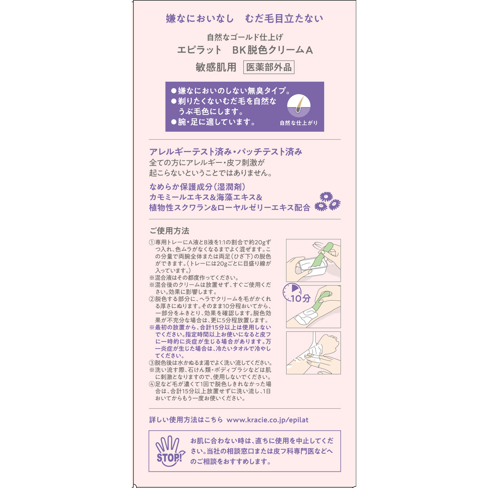 10min日本うまれの脱色クリーム嫌なにおいなし むだ毛目立たない自然なゴールド仕上げ●嫌なにおいのしない無臭タイプ。●剃りたくないむだ毛を自然なうぶ毛色にします。●腕・足に適しています。自然な仕上がりアレルギーテスト済み・パッチテスト済み全ての方にアレルギー・皮フ刺激が起こらないということではありません。なめらか保護成分(湿潤剤)カモミールエキス&海藻エキス&植物性スクワラン&ローヤルゼリーエキス配合