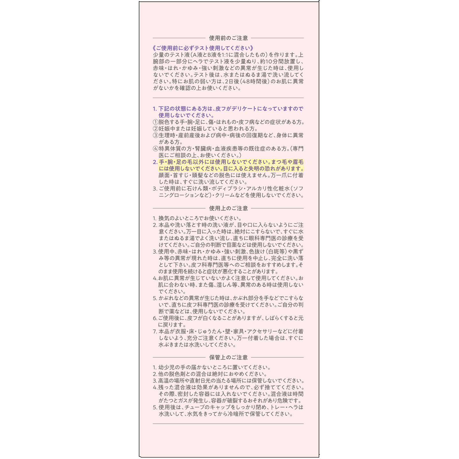 4.足など毛が濃くて1回で脱色しきれなかった場合は、合計15分以上放置せずに洗い流し、1日おいてからもう一度お使いください。