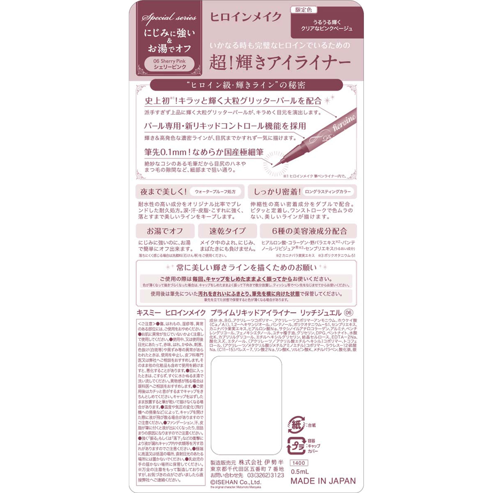 超!輝きラメ耐久アイライナー掟 ラインも恋も簡単に落ちてはなりません。GLITTER キラめきパールin涙袋にも限定色 うるうる輝くクリアなピンクベージュいかなる時も完璧なヒロインでいるための超!輝きアイライナー“ヒロイン級・輝きライン”の秘密○史上初※1!キラッと輝く大粒グリッターパールを配合派手すぎず上品に輝く大粒グリッターパールが、キラめく目元を演出します。○パール専用・新リキッドコントロール機能を採用輝き&高発色な濃密ラインが、目尻までかすれず一気に描けます。○筆先0.1mm!なめらか国産極細筆絶妙なコシのある毛筆だから目尻のハネやまつ毛の隙間など、細部まで狙い通り。※1 ヒロインメイク筆ペンライナー内で。○夜まで美しく!ウォータープルーフ処方耐水性の高い成分をオリジナル比率でブレンドした耐久処方。涙・汗・皮脂・こすれに強く、落とすまで美しいラインをキープします。○しっかり密着!ロングラスティングカラー伸縮性の高い密着成分をダブルで配合。ピタッと定着し、ワンストロークで色ムラのない、美しいラインが描けます。○お湯でオフにじみに強いのに、お湯で簡単にオフ出来ます。落ちにくくく感じる場合は洗顔料(石けん等)をお使いください。○速乾タイプメイク中のよれ、にじみ、まばたきにも負けません。○6種の美容液成分配合ヒアルロン酸・コラーゲン・野バラエキス※2・パンテノール・リピジュア※3・センブリエキス(うるおい成分)※2 カニナバラ果実エキス※3 ポリクオタニウム-51