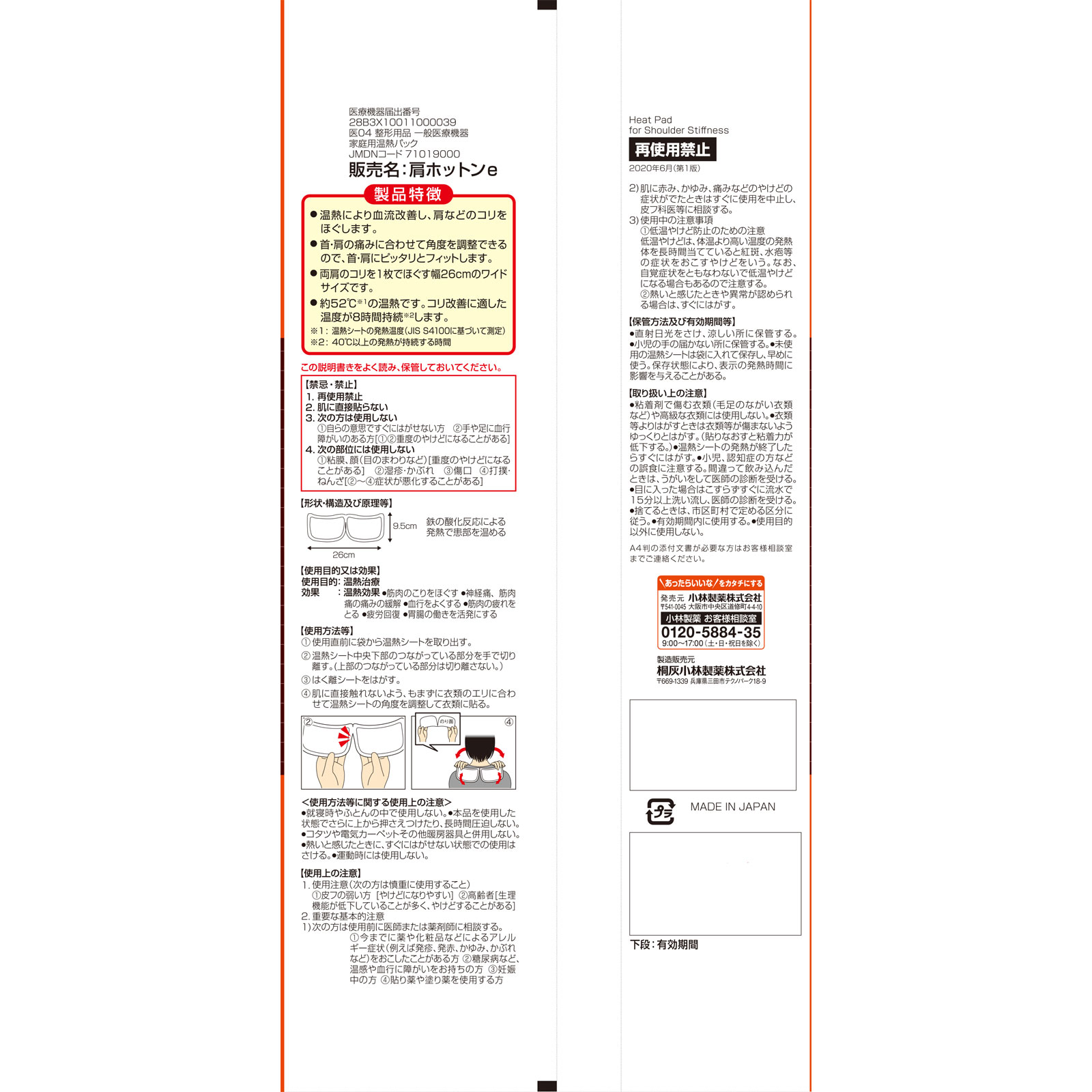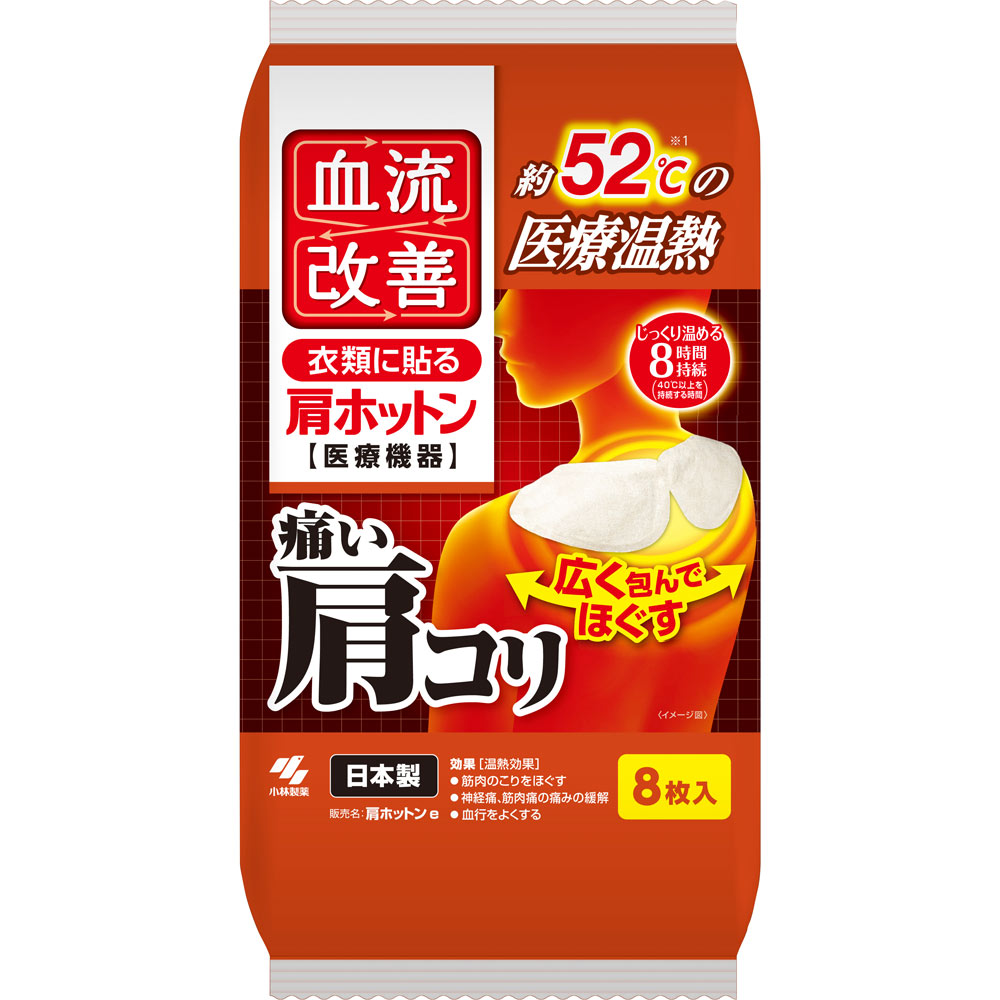 衣類に貼る約52℃※1の医療温熱じっくり温める8時間持続(40℃以上を持続する時間)広く包んでほぐす痛い肩コリ●温熱により血流改善し、肩などのコリをほぐします。●首・肩の痛みに合わせて角度を調整できるので、首・肩にピッタリとフィットします。●両肩のコリを1枚でほぐす幅26cmのワイドサイズです。●約52℃※1の温熱です。コリ改善に適した温度が8時間持続※2します。※1:温熱シートの発熱温度(JIS S4100に基づいて測定)※2:40℃以上の発熱が持続する時間【形状・構造及び原理等】鉄の酸化反応による発熱で患部を温める