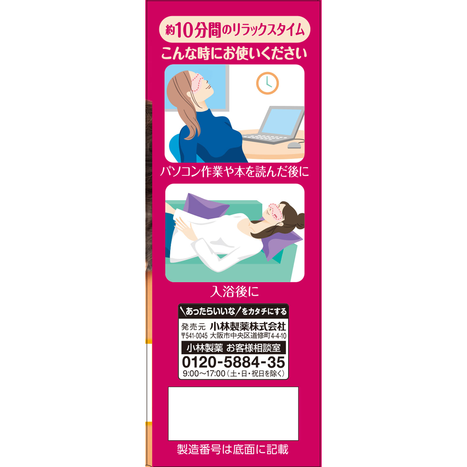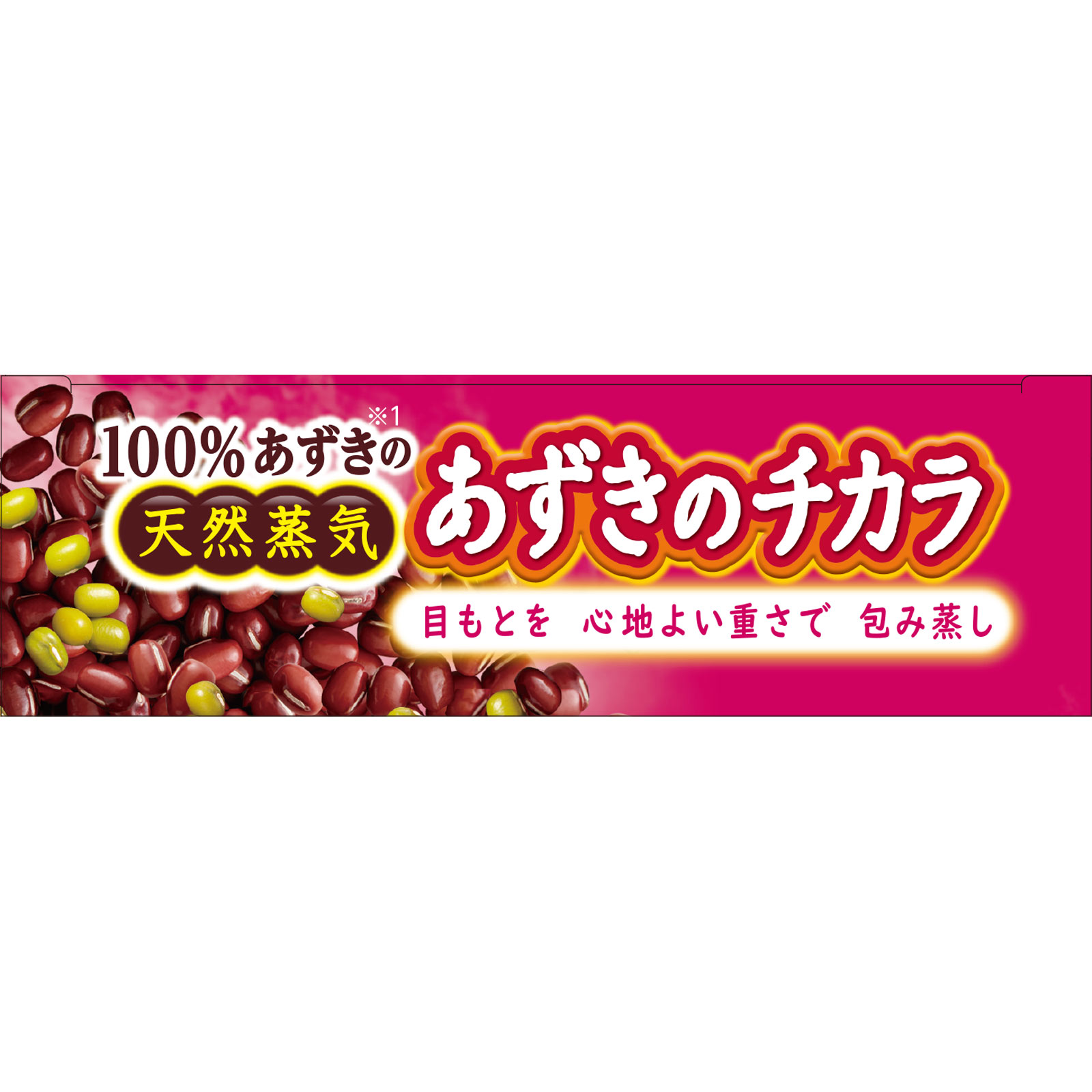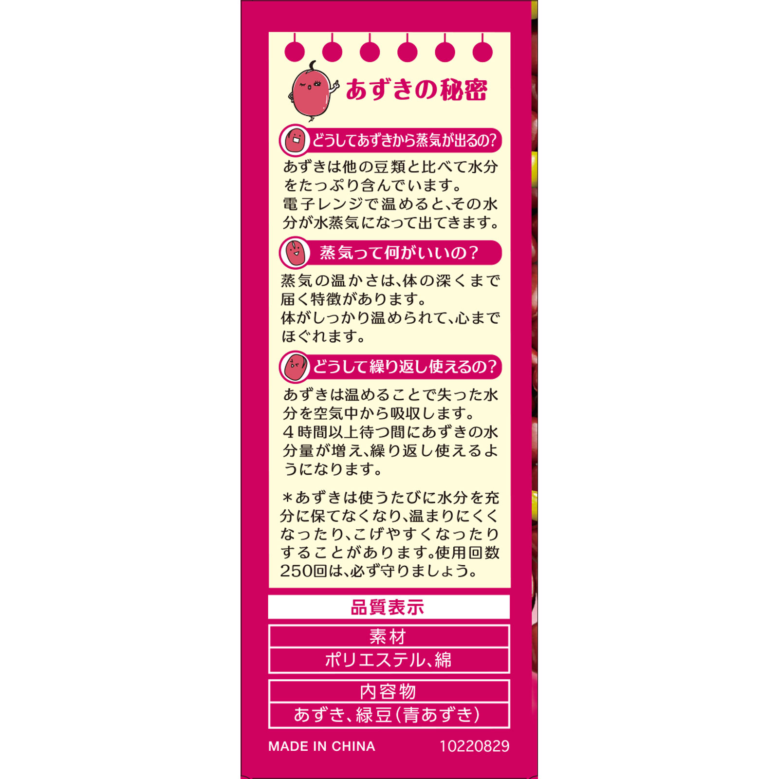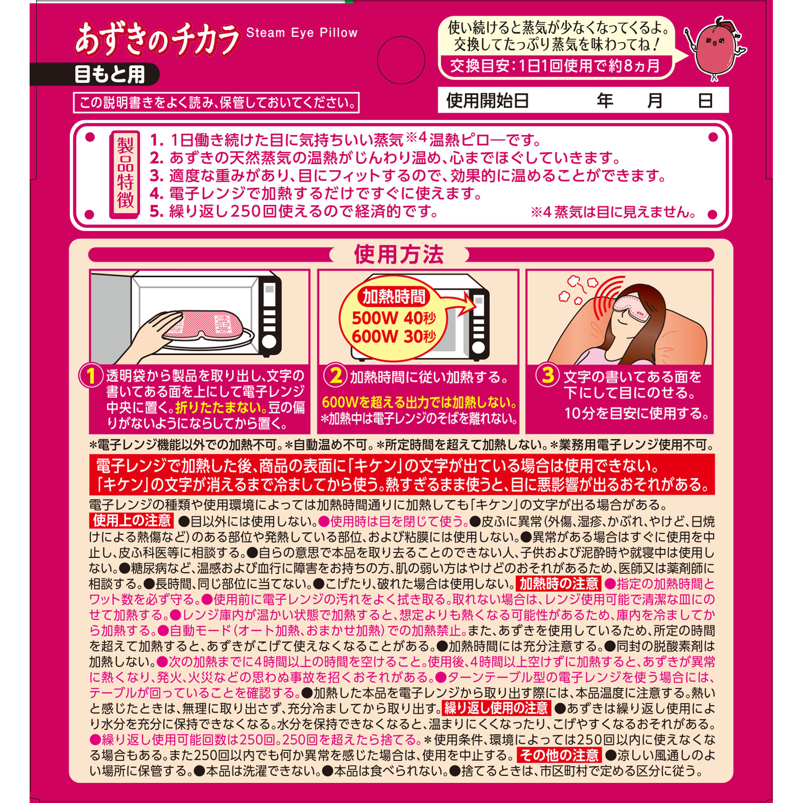 チンしてレンジで簡単ほっこりリラックス目もとを心地よい重さで包み蒸し自然のやさしさ100%あずき※1の天然蒸気働き続けた目にじわ~っと心までほぐすくり返し使えて、1回約3円*1約40℃※2温かさ 約10分※3続く・・・*1 使用1回につき約3円程度(メーカー希望小売価格〈税抜〉から算出)※1 あずきと緑豆(青あずき)使用※2 製品表面の温度※3 自社試験方法により測定。使用環境により若干の差異があります。約10分間のリラックスタイムこんな時にお使いくださいパソコン作業や本を読んだ後に入浴後に使い続けると蒸気が少なくなってくるよ。交換してたっぷり蒸気を味わってね!交換目安:1日1回使用で約8ヵ月1.1日働き続けた目に気持ちいい蒸気※4温熱ピローです。2.あずきの天然蒸気の温熱がじんわり温め、心までほぐしていきます。3.適度な重みがあり、目にフィットするので、効果的に温めることができます。4.電子レンジで加熱するだけですぐに使えます。5.繰り返し250回使えるので経済的です。※4 蒸気は目に見えません。