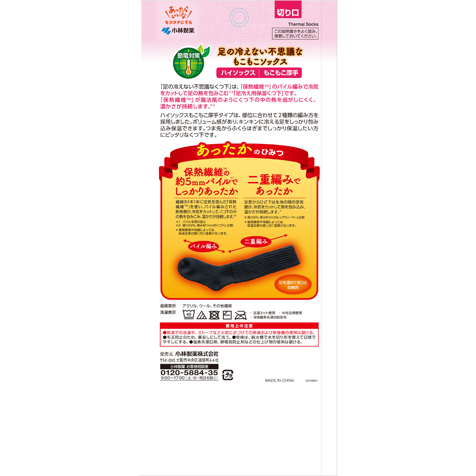フリーサイズサイズ目安 23-27cmつま先からふくらはぎまであったか足あったか包み込む二重編み仕様※スウェットの上に重ね履きできるふんわり保温層くつろぐ暖かさ節電対策に※足首からひざ下「足の冷えない不思議なくつ下」は、「保熱繊維」のパイル編みで冷気をカットして足の熱を包みこむ※「足冷え用保温くつ下」です。「保熱繊維」が魔法瓶のようにくつ下の中の熱を逃がしにくく、温かさが持続します。※2ハイソックスもこもこ厚手タイプは、部位に合わせて2種類の編み方を採用しました。ボリューム感があり、キンキンに冷える足をしっかり包み込み保温できます。つま先からふくらはぎまでしっかり保温したい方にピッタリなくつ下です。あったかのひみつ○保熱繊維の約5mmパイル※1でしっかりあったか繊維の1本1本に空気を含んだ「保熱繊維」を使い、パイル編みされた断熱層が、冷気をカットして、くつ下の中の熱を包みこみ、温かさが持続します。※2※1 パイル半周の長さ※2 綿100%、厚み約1mmのくつ下と比較*使用環境や体調によっては、保温効果の感じ方に差異が生じます。○二重編みであったか足首からひざ下は生地の間の空気層が、冷気をカットして熱を包み込み、温かさが持続します。※※綿100%、厚み約1mmのレッグウォーマーと比較*使用環境や体調によっては、保温効果の感じ方に差異が生じます。足を温めて使うと効果的
