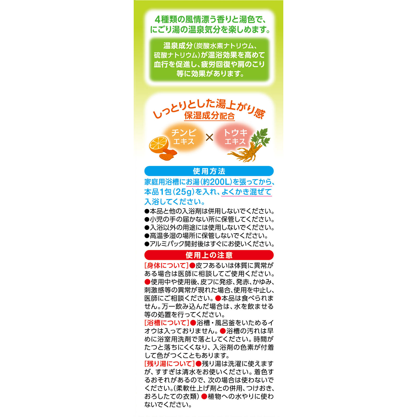ゆったり温泉気分北海道登別 群馬草津 兵庫有馬 大分別府薬用入浴剤4種類の風情漂う香りと湯色で、にごり湯の温泉気分を楽しめます。温泉成分(炭酸水素ナトリウム、硫酸ナトリウム)が温浴効果を高めて血行を促進し、疲労回復や肩のこり等に効果があります。しっとりした湯上がり感保湿成分配合チンピエキス×ショウガエキス