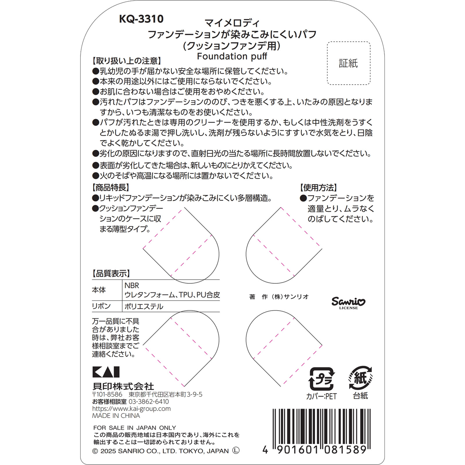 ファンデーションが染みこみにくいパフ(クッションファンデ用) マイメロディ 1個