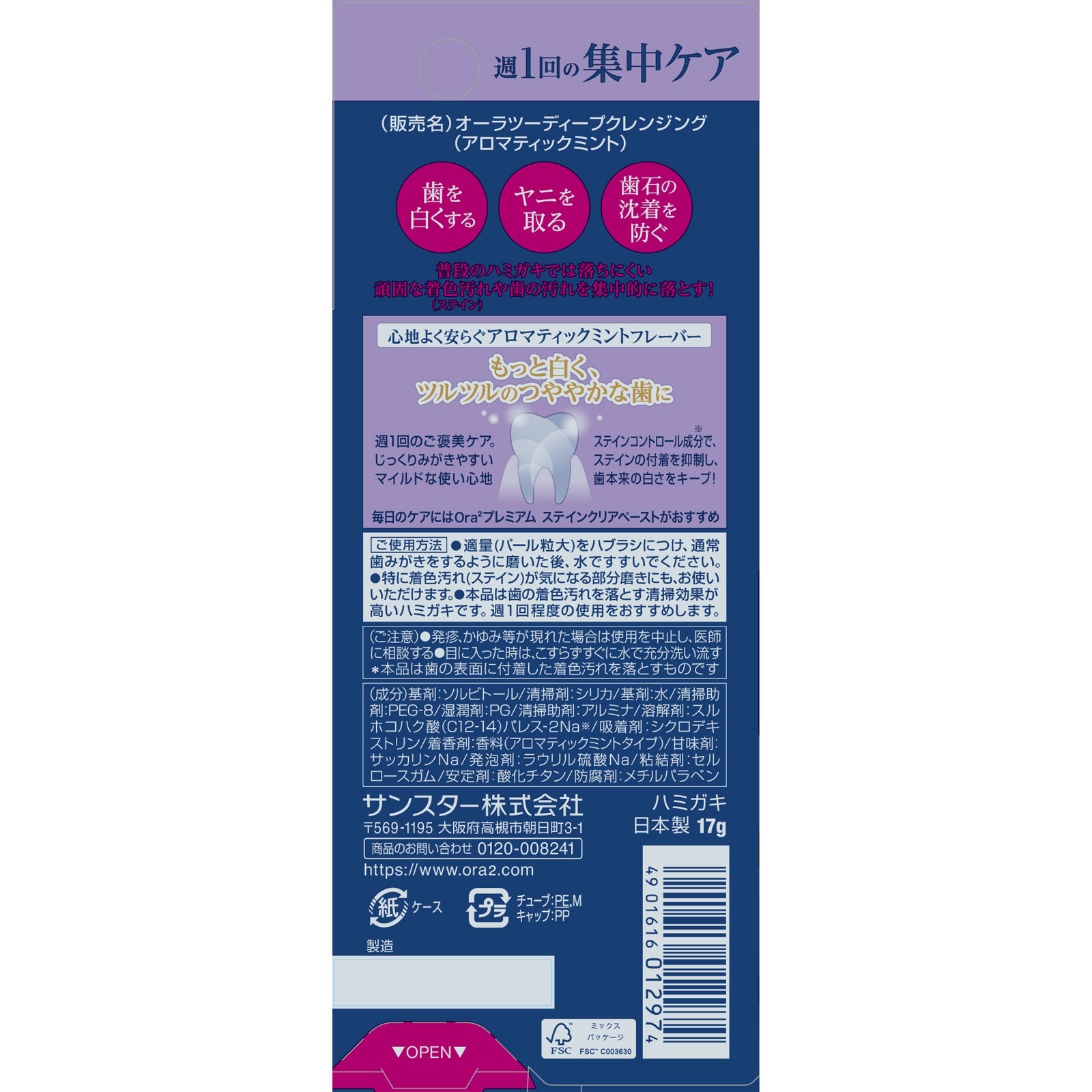 スペシャルケア週1回の歯の集中美白Ora2ハミガキ史上最大濃度のステイン除去成分(清掃剤)配合頑固な着色汚れ(ステイン)やニオイのもとまでディープクレンジング週1回の集中ケア歯を白くするヤニを取る歯石の沈着を防ぐ普段のハミガキでは落ちにくい頑固な着色汚れ(ステイン)や歯の汚れを集中的に落とす!心地よく安らぐアロマティックミントフレーバーもっと白く、ツルツルのつややかな歯に週1回のご褒美ケア。じっくりみがきやすいマイルドな使い心地ステインコントロール成分※で、ステインの付着を抑制し、歯本来の白さをキープ!※スルホコハク酸(C12-14)パレス-2Na