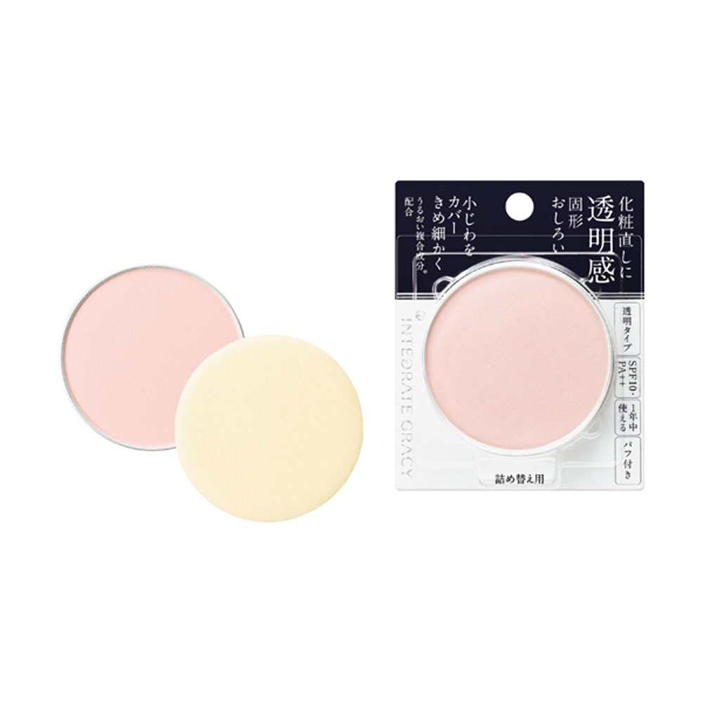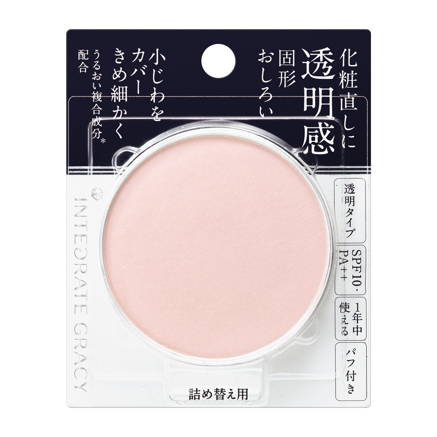 小じわ・毛穴をカバーし透明肌へ。化粧直しに最適な固型おしろいスルスルとなめらかに肌に広がり、小じわや毛穴をカバーします。 きめ細かく、透明感のある肌をひきだしながら、ファンデーションのもちを高めます。 紫外線を防ぎ、化粧直しにおすすめです。 透明タイプ。SPF10・PA++。1年中使える。パフ付き。詰め替え用。 SPF 10 PA++