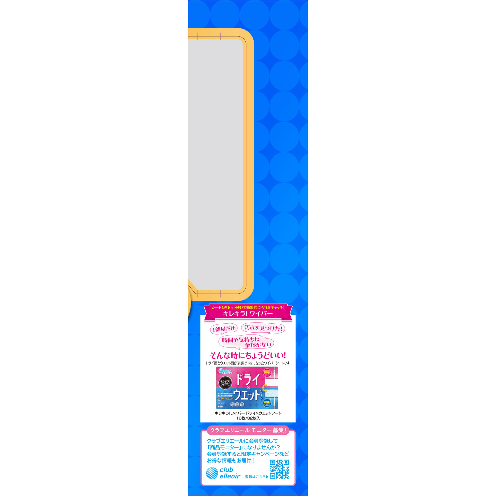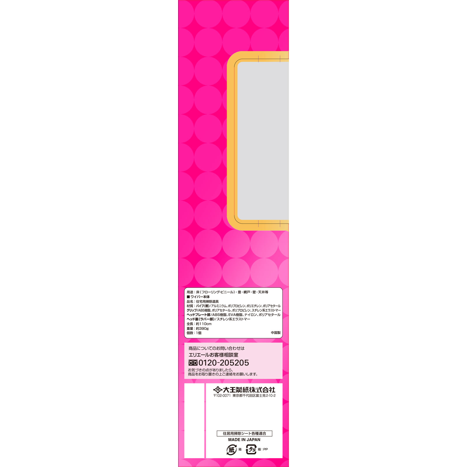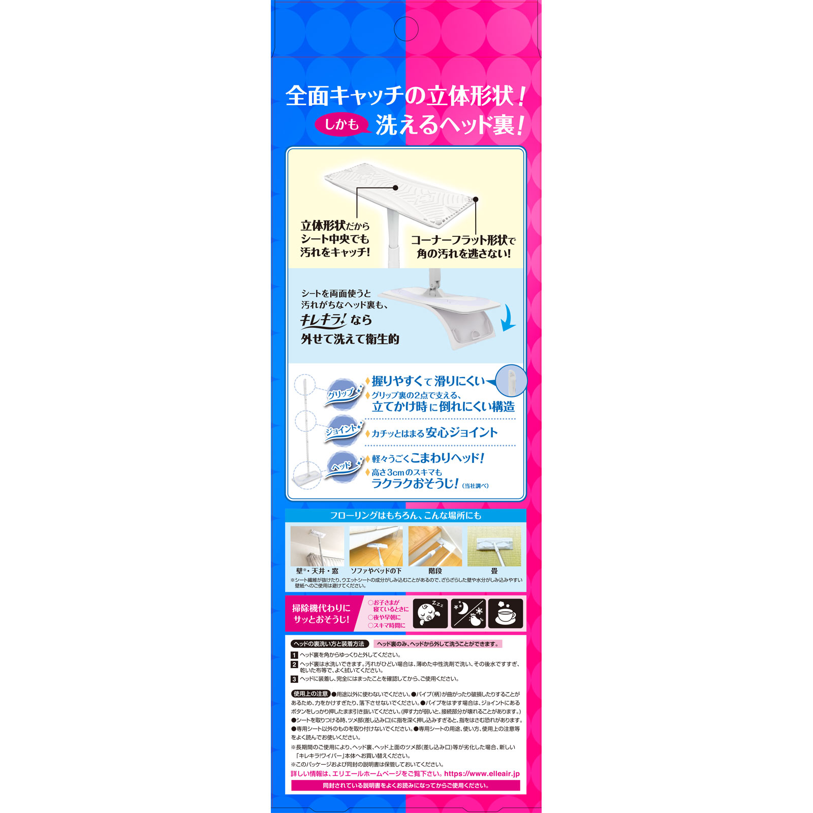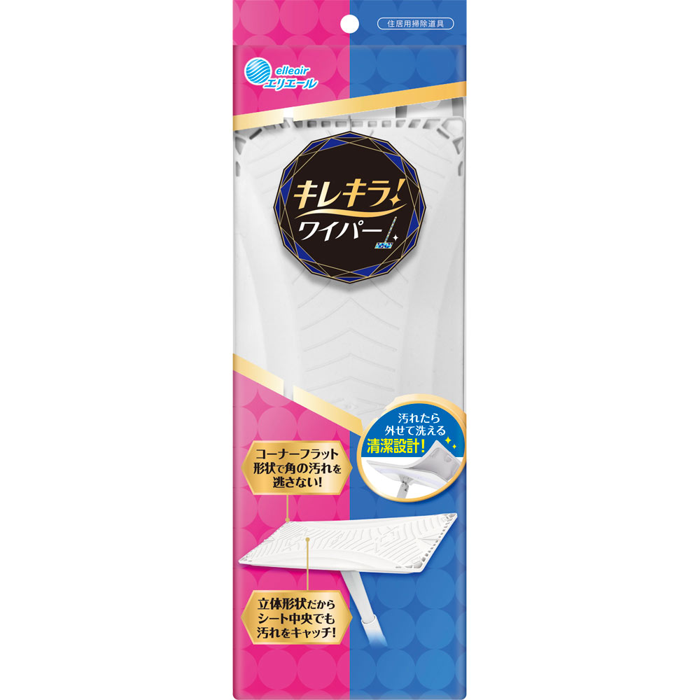 住居用掃除道具汚れたら外せて洗える清潔設計!■ワイパー本体全長:約110cm重量:約390g住居用掃除シート各種適合全面キャッチの立体形状!しかも洗えるヘッド裏!立体形状だからシート中央でも汚れをキャッチ!コーナーフラット形状で角の汚れを逃さない!シートを両面使うと汚れがちなヘッド裏も、キレキラ!なら外せて洗えて衛生的グリップ◆握りやすくて滑りにくい◆グリップ裏の2点で支える、立てかけ時に倒れにくい構造ジョイント◆カチッとはまる安心ジョイントヘッド◆軽々うごくこまわりヘッド!◆高さ3cmのスキマもラクラクおそうじ!(当社調べ)フローリングはもちろん、こんな場所にも壁※・天井・窓 ソファやベッドの下 階段 畳※シート繊維が抜けたり、ウエットシートの成分がしみ込むことがあるので、ざらざらした壁や水分がしみ込みやすい壁紙へのご使用は避けてください。掃除機代わりにサッとおそうじ!○お子さまが寝ているときに○夜や早朝に○スキマ時間に
