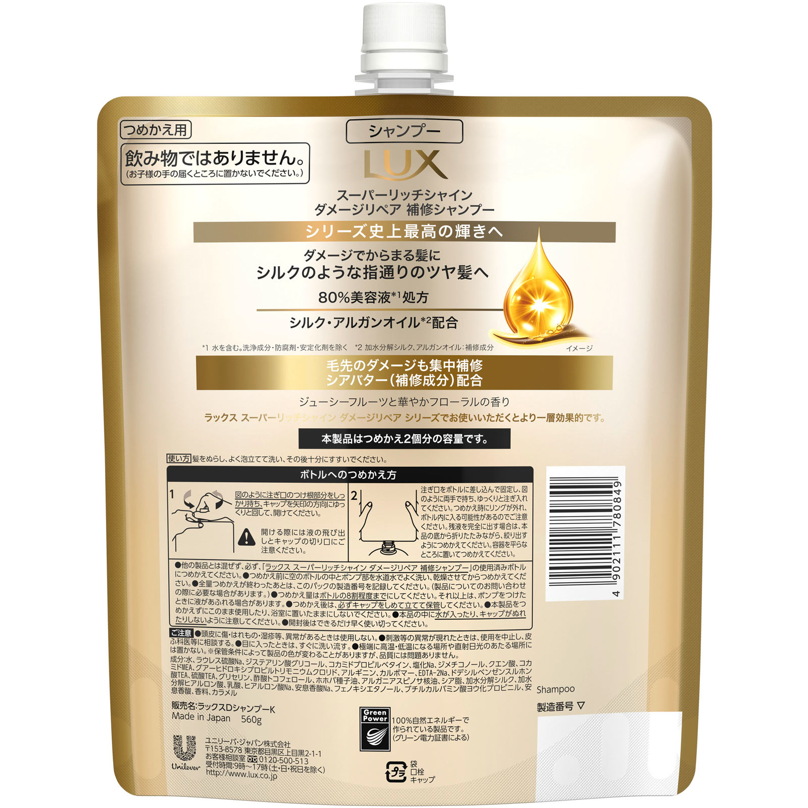 傷んだ髪に シルクのような指通りのツヤ髪へダメージを濃密補修80%美容液+シアバター配合大サイズ通常サイズの2個分※通常つめかえ280g比シリーズ史上最高の輝きへダメージでからまる髪にシルクのような指通りのツヤ髪へ80%美容液*1処方シルク・アルガンオイル*2配合*1 水を含む。洗浄成分・防腐剤・安定化剤を除く*2 加水分解シルク、アルガンオイル:補修成分毛先のダメージも集中補修シアバター(補修成分)配合ジューシーフルーツと華やかフローラルの香り