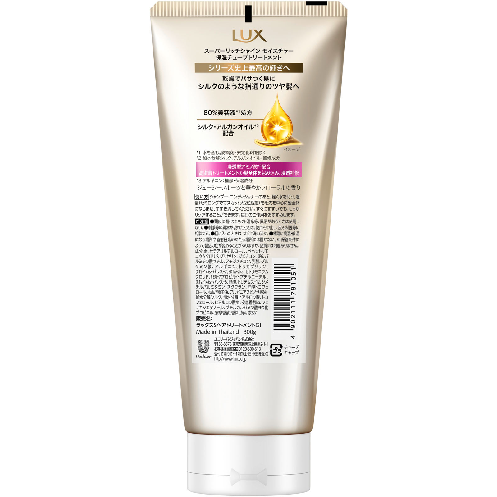 通常サイズ(通常品150g)の2個分うるツヤ保湿毎日の時短ケアシリーズ史上最高の輝きへ乾燥でパサつく髪にシルクのような指通りのツヤ髪へ80%美容液*1処方シルク・アルガンオイル*2配合*1 水を含む。防腐剤・安定化剤を除く*2 加水分解シルク、アルガンオイル:補修成分浸透型アミノ酸*3配合高密着トリートメントが髪全体を包み込み、浸透補修*3 アルギニン:補修・保湿成分ジューシーフルーツと華やかフローラルの香り