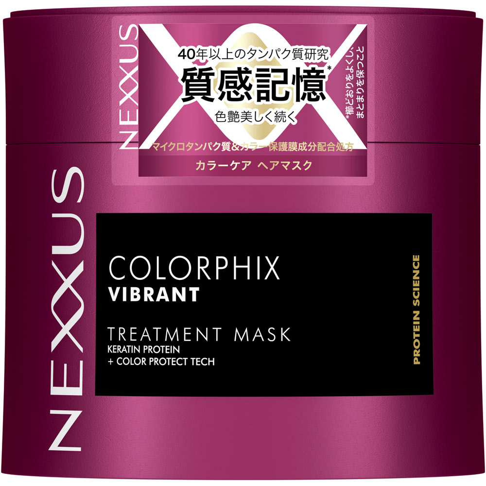 40年以上のタンパク質研究質感記憶*色艶美しく続く*櫛どおりをよくし、まとまりを保つことマイクロタンパク質&カラー保護膜成分配合処方40年以上に渡り、タンパク質研究に注力。サロン発祥ブランド。質感記憶*1。色艶、美しく続く。マイクロタンパク質*2&カラー保護膜成分*3配合処方。上質でなめらかなテクスチャーでカラーした髪に高密着。高濃度*4で配合されたカラー保護膜成分で、髪のカラー成分とタンパク質をぎゅっと閉じ込め、芯まで集中補修。洗い流した瞬間、感じる指通り。●イオン化ケラチン*5配合●マリーゴールドが花開くさわやかな香り*1 櫛どおりをよくし、まとまりを保つこと*2 加水分解ケラチン:補修成分*3 (アクリル酸アミドプロピルトリモニウムクロリド/アクリル酸アミド)コポリマー:毛髪保護成分*4 ネクサス カラーフィックストリートメントと比較*5 (ジヒドロキシメチルシリルプロポキシ)ヒドロキシプロピル加水分解ケラチン:補修成分