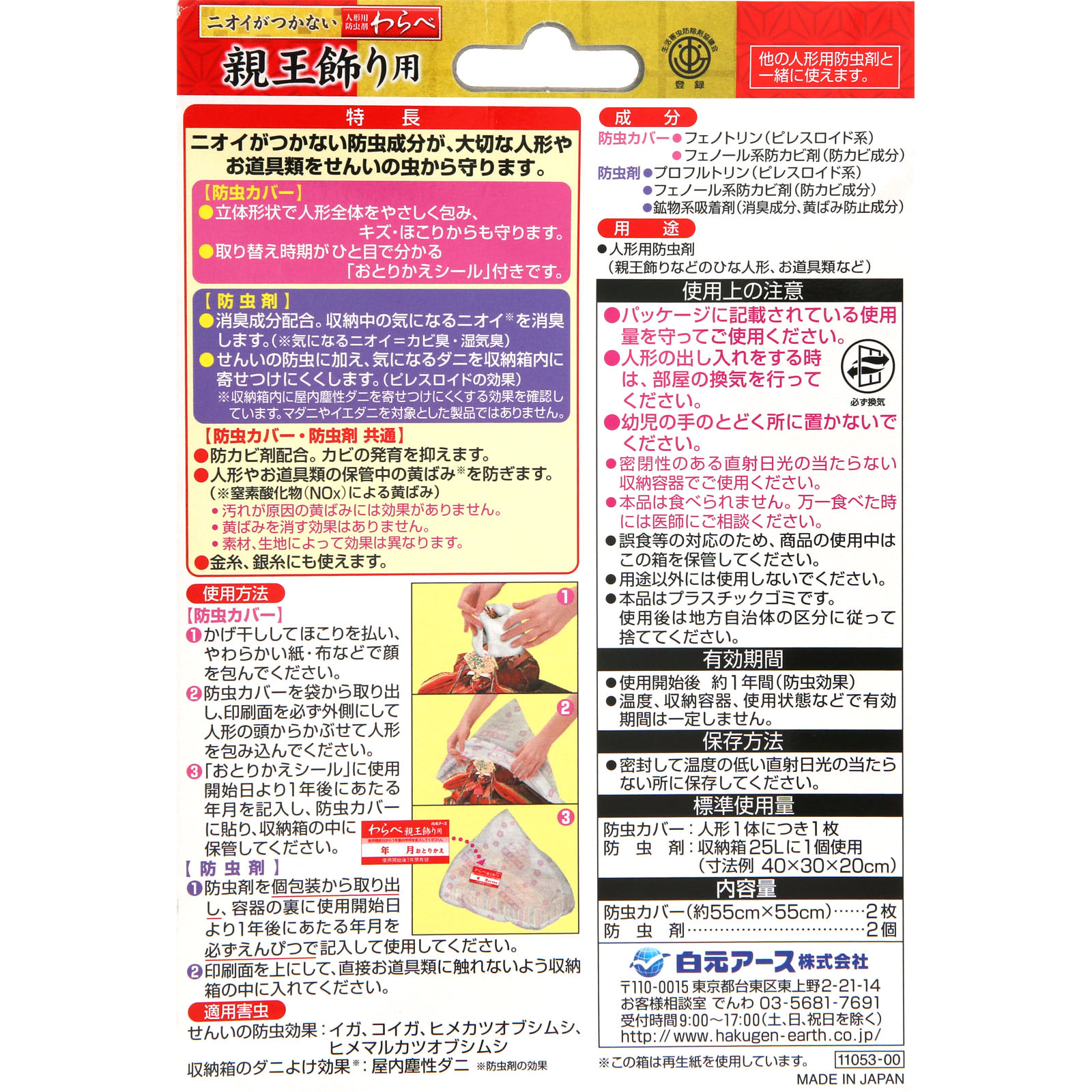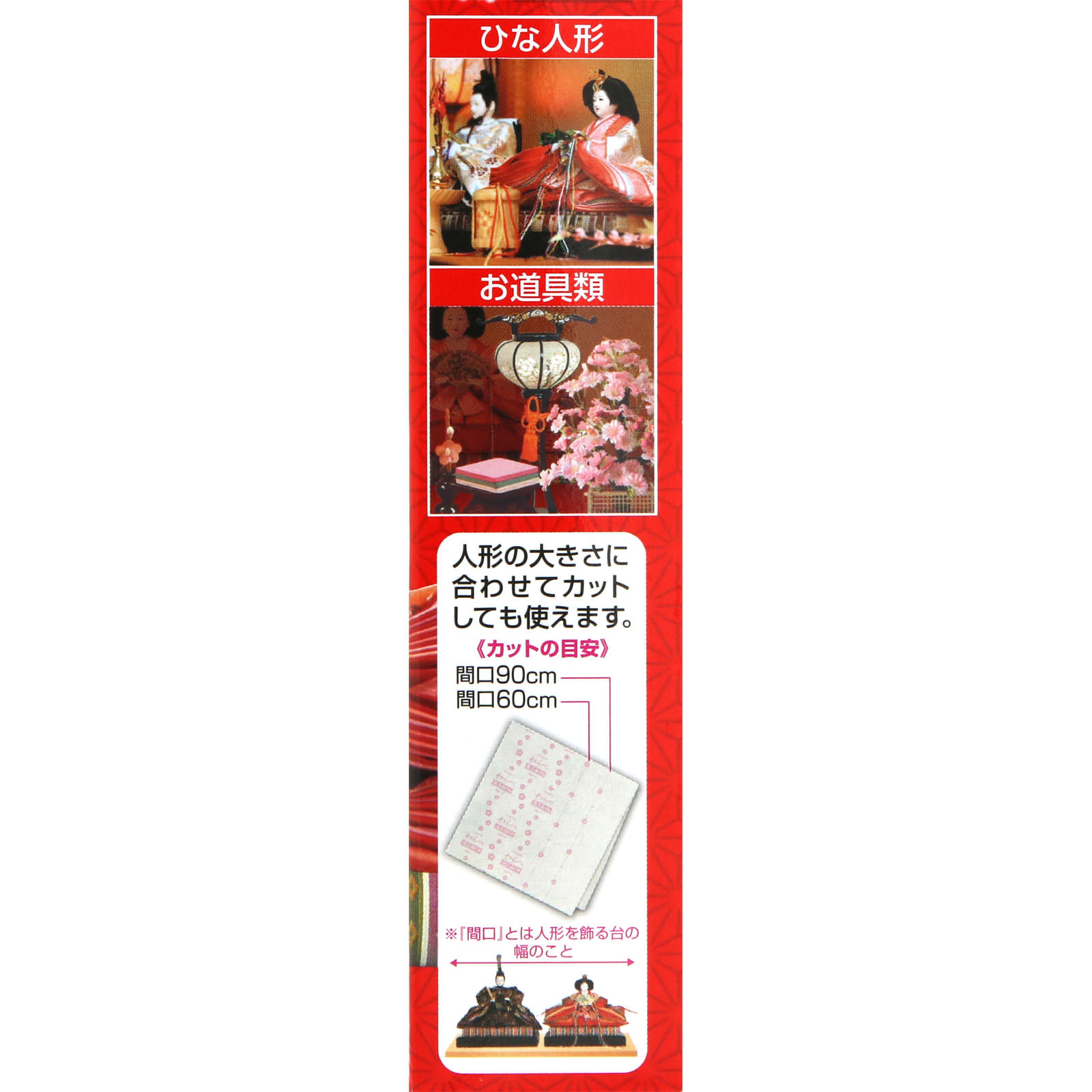 人形用防虫剤消臭※ 黄ばみ防止 収納箱のダニよけ効果※※防虫剤による効果せんい製品防虫剤(フェノトリン製剤 プロフルトリン製剤)防虫カバー:かぶせるだけ防虫剤:お道具の収納に人形の大きさに合わせてカットしても使えます。《カットの目安》間口90cm 間口60cm他の人形用防虫剤と一緒に使えます。ニオイがつかない防虫成分が、大切な人形やお道具類をせんいの虫から守ります。【防虫カバー】●立体形状で人形全体をやさしく包み、キズ・ほこりからも守ります。●取り替え時期がひと目で分かる「おとりかえシール」付きです。【防虫剤】●消臭成分配合。収納中の気になるニオイ※を消臭します。(※気になるニオイ=カビ臭・湿気臭)●せんいの防虫に加え、気になるダニを収納箱内に寄せつけにくくします。(ピレスロイドの効果)※収納箱内に屋内塵性ダニを寄せつけにくくする効果を確認しています。マダニやイエダニを対象とした製品ではありません。【防虫カバー・防虫剤 共通】●防カビ剤配合。カビの発育を抑えます。●人形やお道具類の保管中の黄ばみ※を防ぎます。(※窒素酸化物(NOx)による黄ばみ)・汚れが原因の黄ばみには効果がありません。・黄ばみを消す効果はありません。・素材、生地によって効果は異なります。●金糸、銀糸にも使えます。○適用害虫せんいの防虫効果:イガ、コイガ、ヒメカツオブシムシ、ヒメマルカツオブシムシ収納箱のダニよけ効果※:屋内塵性ダニ※防虫剤の効果
