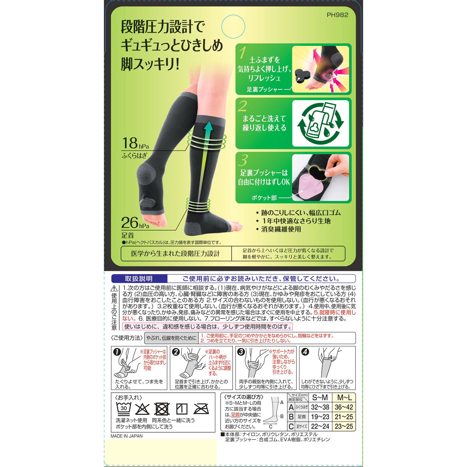 ひざ下丈1週間頑張った私へ休日前にググッとリセット歩くだけでツボ押し足裏プッシャー付きちょっとした時間に脚ケア段階圧力設計でギュギュっとひきしめ脚スッキリ!18hPa ふくらはぎ26hPa 足首1 土ふまずを気持ちよく押し上げ、リフレッシュ2 まるごと洗えて繰り返し使える3 足裏プッシャーは自由に付けはずしOK・跡のこりしにくい、幅広口ゴム・1年中快適なさらり生地・消臭繊維使用医学から生まれた段階圧力設計足首から上へいくほど圧力が低くなる設計で脚を軽やかに、スッキリと美しく整えます。