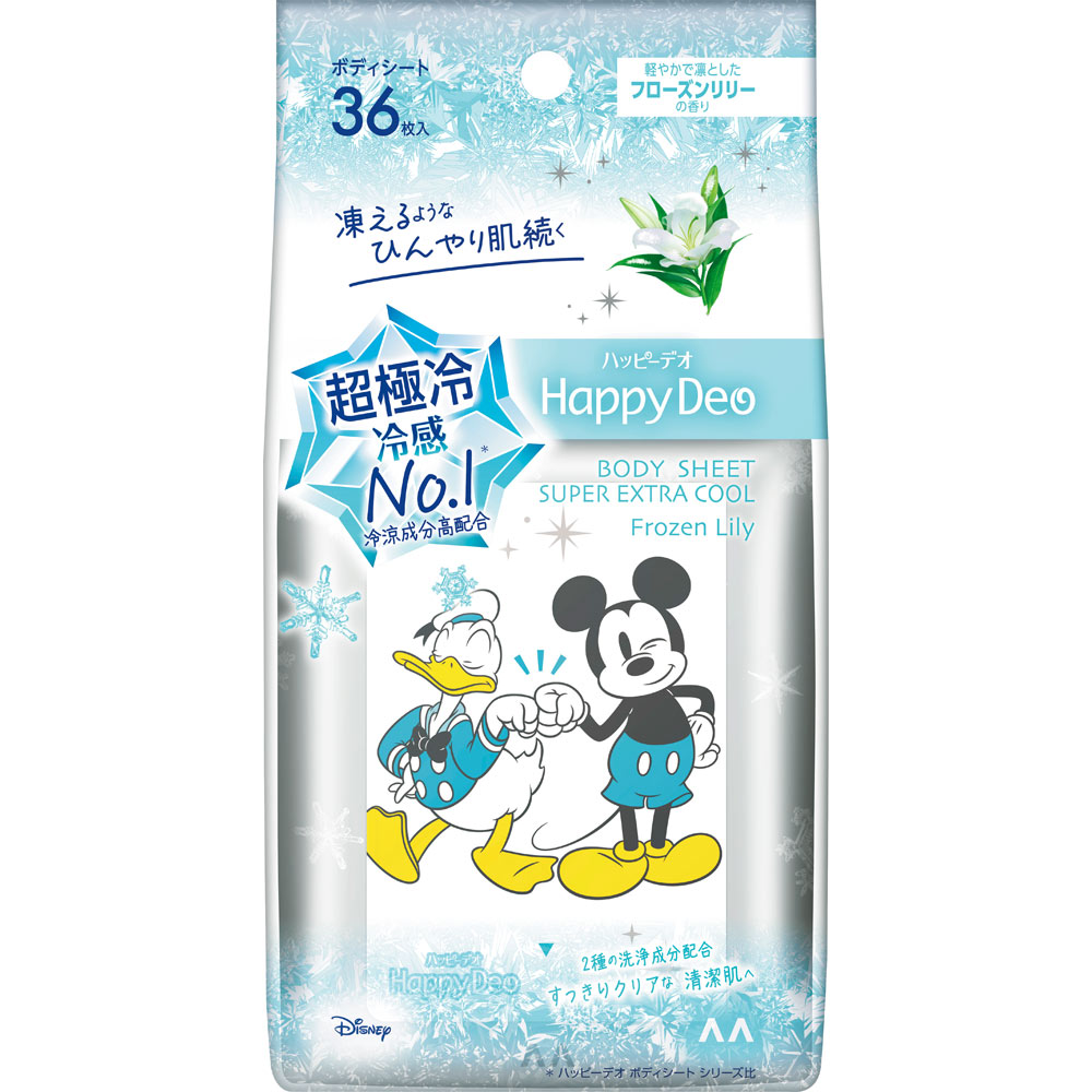 軽やかで凛としたフローズンリリーの香り凍えるようなひんやり肌続く超極冷冷感No.1*冷涼成分高配合2種の洗浄成分配合すっきりクリアな清潔肌へ*ハッピーデオ ボディシート シリーズ比