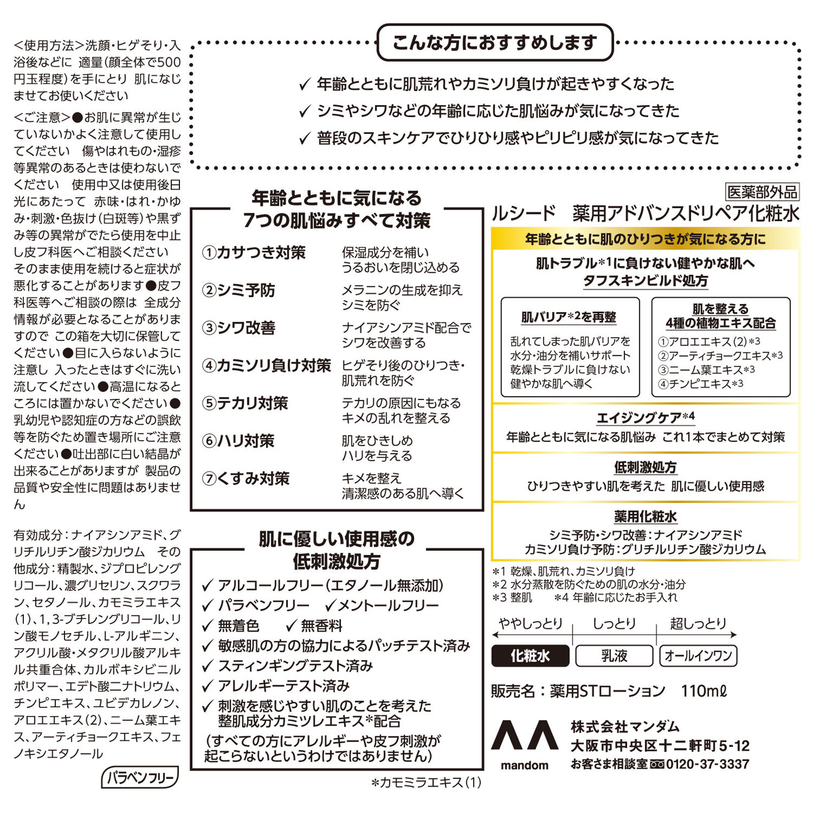 40才からのひりつきやすい肌に肌トラブル*2に負けない肌へシワ シミ*3 くすみ*4 ハリ カミソリ負け*5 テカリ*4 乾燥すべて対策*2 乾燥、肌荒れ、カミソリ負け*3 メラニンの生成を抑えシミを防ぐ*4 テカリ・くすみの原因にもなるキメの乱れを整える*5 カミソリ負けを防ぐ<こんな方におすすめします>・年齢とともに肌荒れやカミソリ負けが起きやすくなった・シミやシワなどの年齢に応じた肌悩みが気になってきた・普段のスキンケアでひりひり感やピリピリ感が気になってきた【年齢とともに気になる7つの肌悩みすべて対策】1.カサつき対策 保湿成分を補いうるおいを閉じ込める2.シミ予防 メラニンの生成を抑えシミを防ぐ3.シワ改善 ナイアシンアミド配合でシワを改善する4.カミソリ負け対策 ヒゲそり後のひりつき・肌荒れを防ぐ5.テカリ対策 テカリの原因にもなるキメの乱れを整える6.ハリ対策 肌をひきしめハリを与える7.くすみ対策 キメを整え清潔感のある肌へ導く【肌に優しい使用感の低刺激処方】アルコールフリー(エタノール無添加)パラベンフリー メントールフリー無着色 無香料敏感肌の方の協力によるパッチテスト済みスティンギングテスト済みアレルギーテスト済み刺激を感じやすい肌のことを考えた整肌成分カミツレエキス*配合(すべての方にアレルギーや皮フ刺激が起こらないというわけではありません)*カモミラエキス(1)○年齢とともに肌のひりつきが気になる方に肌トラブル*1に負けない健やかな肌へタフスキンビルド処方・肌バリア*2を再整乱れてしまった肌バリアを水分・油分を補いサポート乾燥トラブルに負けない健やかな肌へ導く・肌を整える4種の植物エキス配合1.アロエエキス(2)*32.アーティチョークエキス*33.ニーム葉エキス*34.チンピエキス*3○エイジングケア*4年齢とともに気になる肌悩み これ1本でまとめて対策○低刺激処方ひりつきやすい肌を考えた 肌に優しい使用感○薬用化粧水シミ予防・シワ改善:ナイアシンアミドカミソリ負け予防:グリチルリチン酸ジカリウム*1 乾燥、肌荒れ、カミソリ負け*2 水分蒸散を防ぐための肌の水分・油分*3 整肌*4 年齢に応じたお手入れ