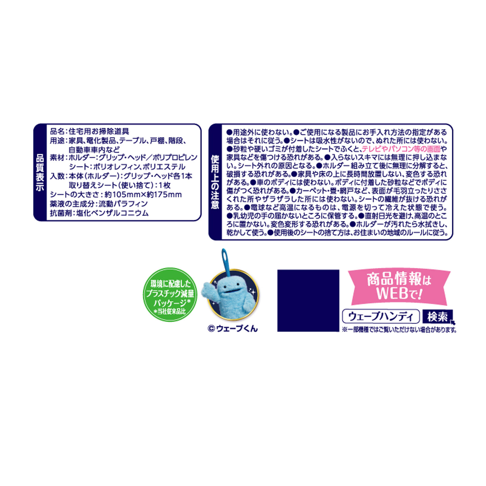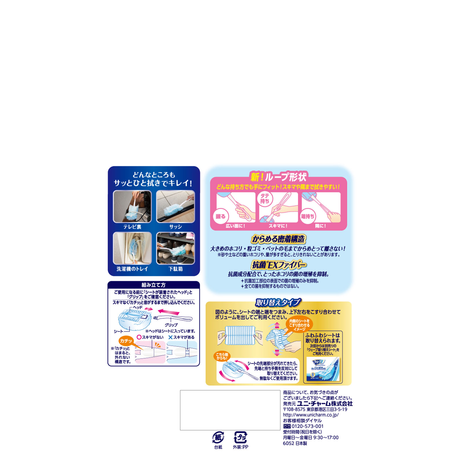 スキマ・隅まで拭きやすい!驚きのひと拭き吸着どんなところもサッとひと拭きでキレイ!テレビ裏 サッシ 洗濯機のトレイ 下駄箱新!ループ形状どんな持ち方でも手にフィット!スキマや隅まで拭きやすい!握る 広い面に!タテ持ち スキマに!端持ち 隅に!○からめる密着構造大きめのホコリ・粒ゴミ・ペットの毛までからめとって離さない!※砂や土などの重いホコリや、量が多すぎると、とりきれないことがあります。○抗菌EXファイバー抗菌成分配合で、とったホコリの菌の増殖を抑制。◆抗菌加工部位の表面での菌の増殖のみを抑制。◆全ての菌を抑制するものではない。取り替えタイプ図のように、シートの端と端をつまみ、上下左右をこすり合わせてボリュームを出してご利用ください。内側のシートをこすり合わせるイメージこちら側からも!シートの先端部分が汚れてきたら、先端と持ち手側を反対にして取り替えてください。無駄なくご使用頂けます。シートの大きさ:約105mm×約175mm