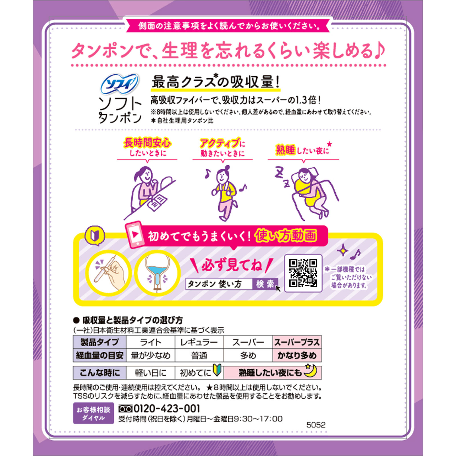 まとめ買いパック特に多い日用生理中でも思いっきり楽しめちゃうスーパーと同じ太さなのに吸収力1.3倍※※個人差があるので、経血量にあわせて取り替えてください。滅菌済タンポンで、生理を忘れるくらい楽しめる最高クラス*の吸収量!高吸収ファイバーで、吸収力はスーパーの1.3倍!*自社生理用タンポン比長時間安心したいときに アクティブに動きたいときに 熟睡したい夜に★●吸収量と製品タイプの選び方(一社)日本衛生材料工業連合会基準に基づく表示製品タイプ:スーパープラス経血量の目安:かなり多めこんな時に:熟睡したい夜にも★8時間以上は使用しないでください。