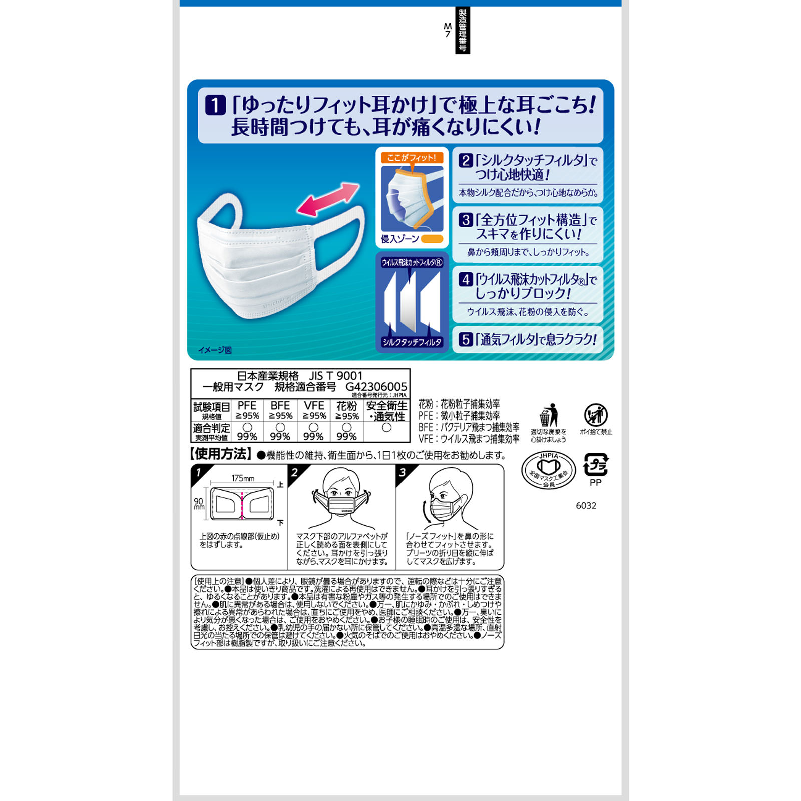 かぜ・花粉用ワイド耳かけ不織布タイプ1「ゆったりフィット耳かけ」で極上な耳ごこち!長時間つけても、耳が痛くなりにくい!2「シルクタッチフィルタ」でつけ心地快適!本物シルク配合だから、つけ心地なめらか。3「全方位フィット構造」でスキマを作りにくい!鼻から頬周りまで、しっかりフィット。4「ウイルス飛沫カットフィルタ」でしっかりブロック!ウイルス飛沫、花粉の侵入を防ぐ。5「通気フィルタ」で息ラクラク!