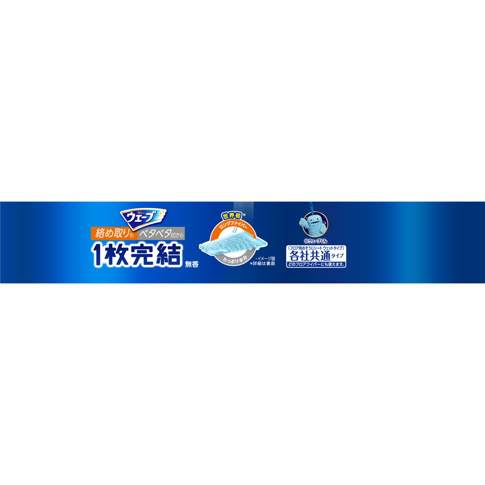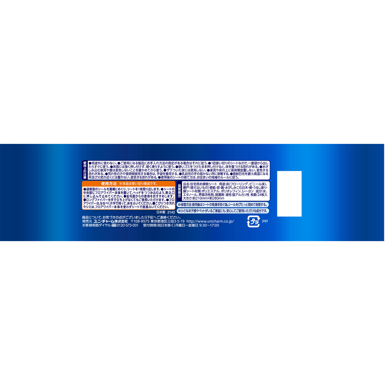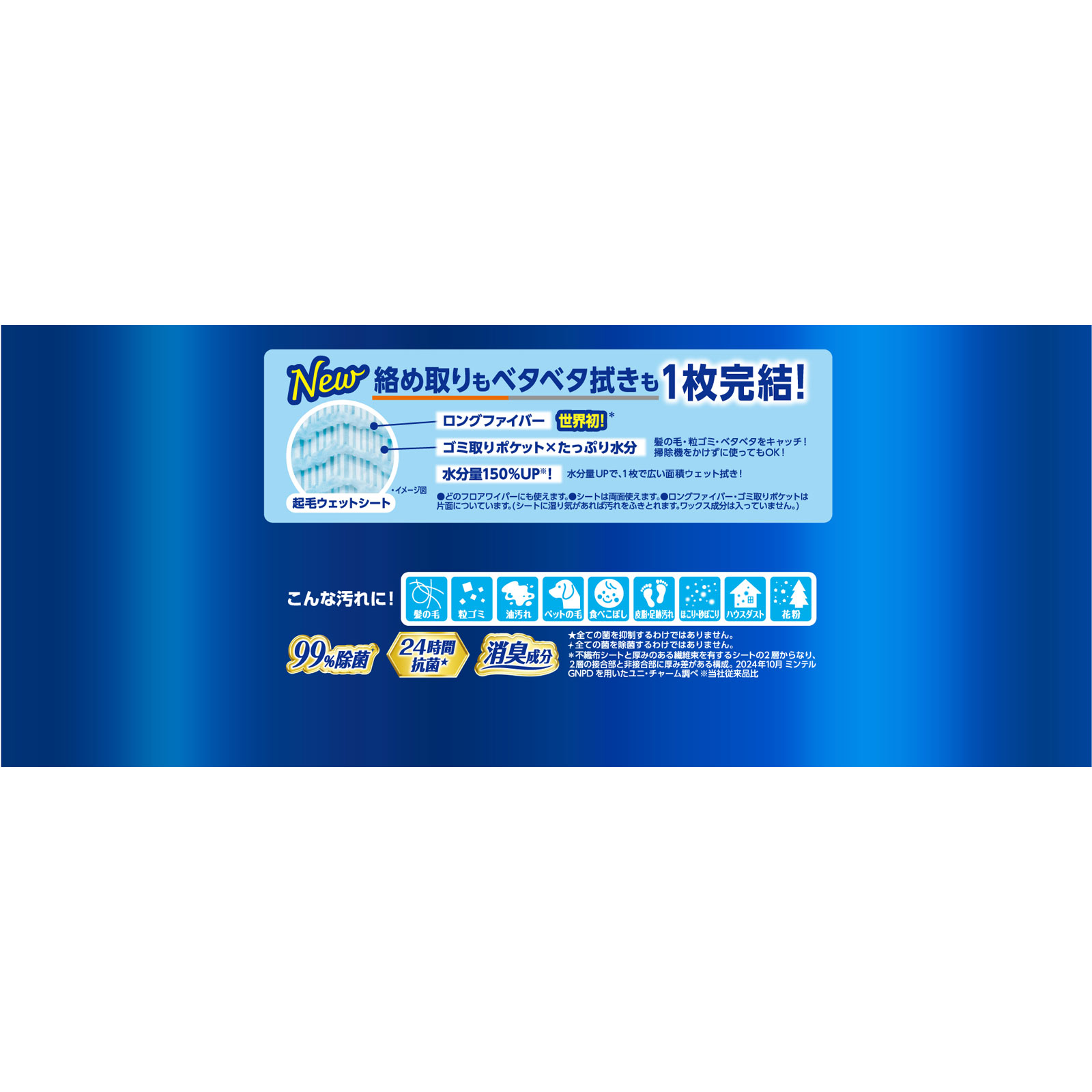 髪の毛・粒ごみ 絡め取りも油汚れ・皮脂汚れ ベタベタ拭きも世界初* ロングファイバーたっぷり水分99%除菌++全ての菌を除菌するわけではありません。フロア用ウェットシート各社共通タイプ無香*不織布シートと厚みのある繊維束を有するシートの2層からなり、2層の接合部と非接合部に厚み差がある構成。*2024年10月ミンテルGNPDを用いたユニ・チャーム調べ絡め取りもベタベタ拭きも1枚完結!ゴミ取りポケット×たっぷり水分 髪の毛・粒ゴミ・ベタベタをキャッチ!掃除機をかけずに使ってもOK!水分量150%UP※! 水分量UPで、1枚で広い面積ウェット拭き!●どのフロアワイパーにも使えます。●シートは両面使えます。●ロングファイバー・ゴミ取りポケットは片側についています。(シートに湿り気があれば汚れをふきとれます。ワックス成分は入っていません。)こんな汚れに! 髪の毛 粒ゴミ 油汚れ ペットの毛 食べこぼし 皮脂・足跡汚れ ほこり・砂ぼこり ハウスダスト 花粉24時間抗菌★ 消臭成分★全ての菌を抑制するわけではありません。*不織布シートと厚みのある繊維束を有するシートの2層からなり、2層の接合部と非接合部に厚み差がある構成。2024年10月 ミンテルGNPDを用いたユニ・チャーム調べ※当社従来品比 大きさ:約210mm×約280mm※小さなお子様やペットがいるご家庭にも、安心してご使用いただける成分です。
