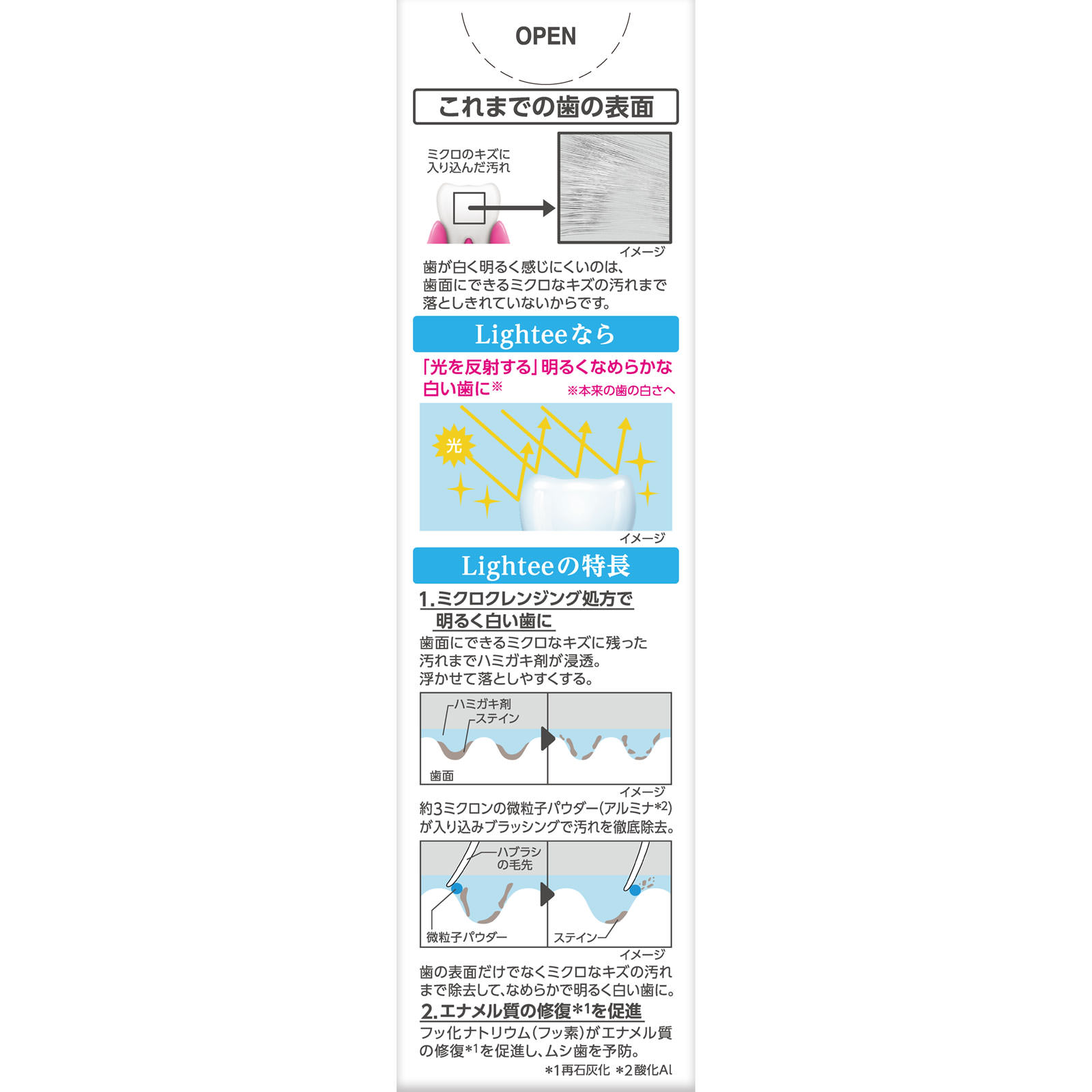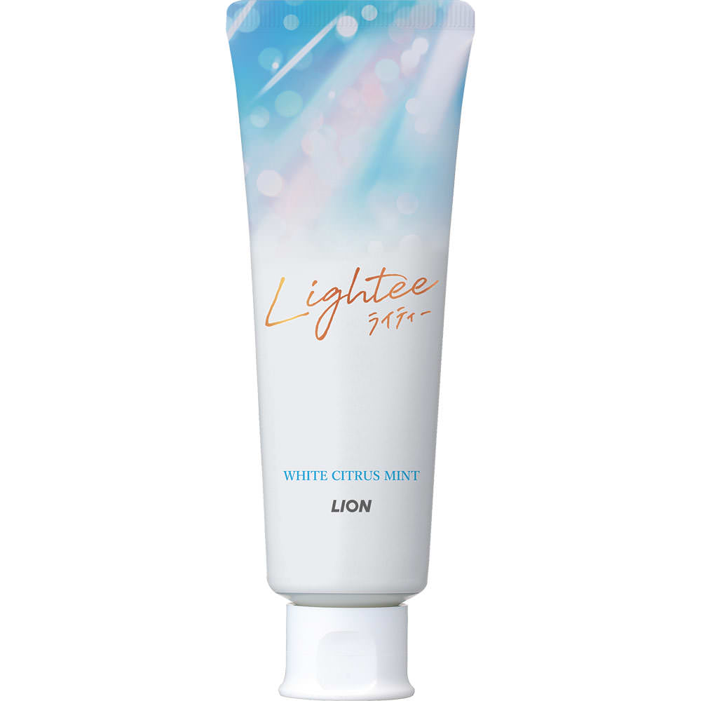 ライオンが本気で作った美白ハミガキ光を反射する明るく白い歯に歯面をなめらかにツヤのある美しさへ高濃度フッ素1450ppm配合爽やかでみずみずしいホワイトシトラスミント香味薬用ハミガキ歯が白く明るく感じにくいのは、歯面にできるミクロなキズの汚れまで落としきれていないからです。○Lighteeなら「光を反射する」明るくなめらかな白い歯に※※本来の歯の白さへ1.ミクロクレンジング処方で明るく白い歯に歯面にできるミクロなキズに残った汚れまでハミガキ剤が浸透。浮かせて落としやすくする。約3ミクロンの微粒子パウダー(アルミナ*2)が入り込みブラッシングで汚れを徹底除去。歯の表面だけでなくミクロなキズの汚れまで除去して、なめらかで明るく白い歯に。2.エナメル質の修復*1を促進フッ化ナトリウム(フッ素)がエナメル質の修復*1を促進し、ムシ歯を予防。*1 再石灰化*2 酸化Al