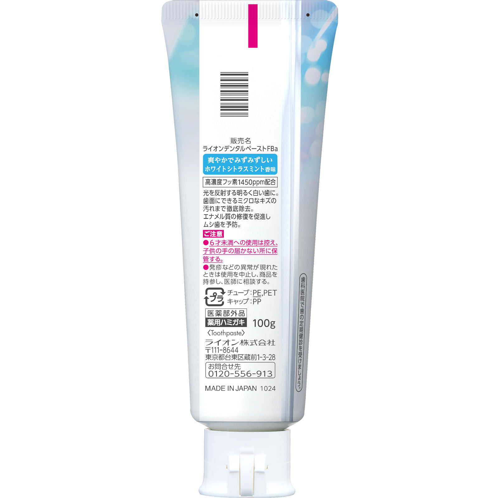 湿潤剤・・・ソルビット液、PG/清掃剤・・・無水ケイ酸A/薬用成分・・・PEG-8、無水ピロリン酸Na、フッ化ナトリウム(フッ素として1450ppm)、ラウロイルサルコシンNa/粘度調整剤・・・キサンタンガム、無水ケイ酸/発泡剤・・・ラウリル硫酸Na、POE硬化ヒマシ油/光沢剤・・・酸化Al/香味剤・・・香料(ホワイトシトラスミントタイプ)、サッカリンNa/安定剤・・・酸化Ti/清涼剤・・・メントール/洗浄剤・・・炭酸水素Na/粘結剤・・・ポリアクリル酸Na/pH調整剤・・・水酸化ナトリウム液/保存剤・・・パラベン