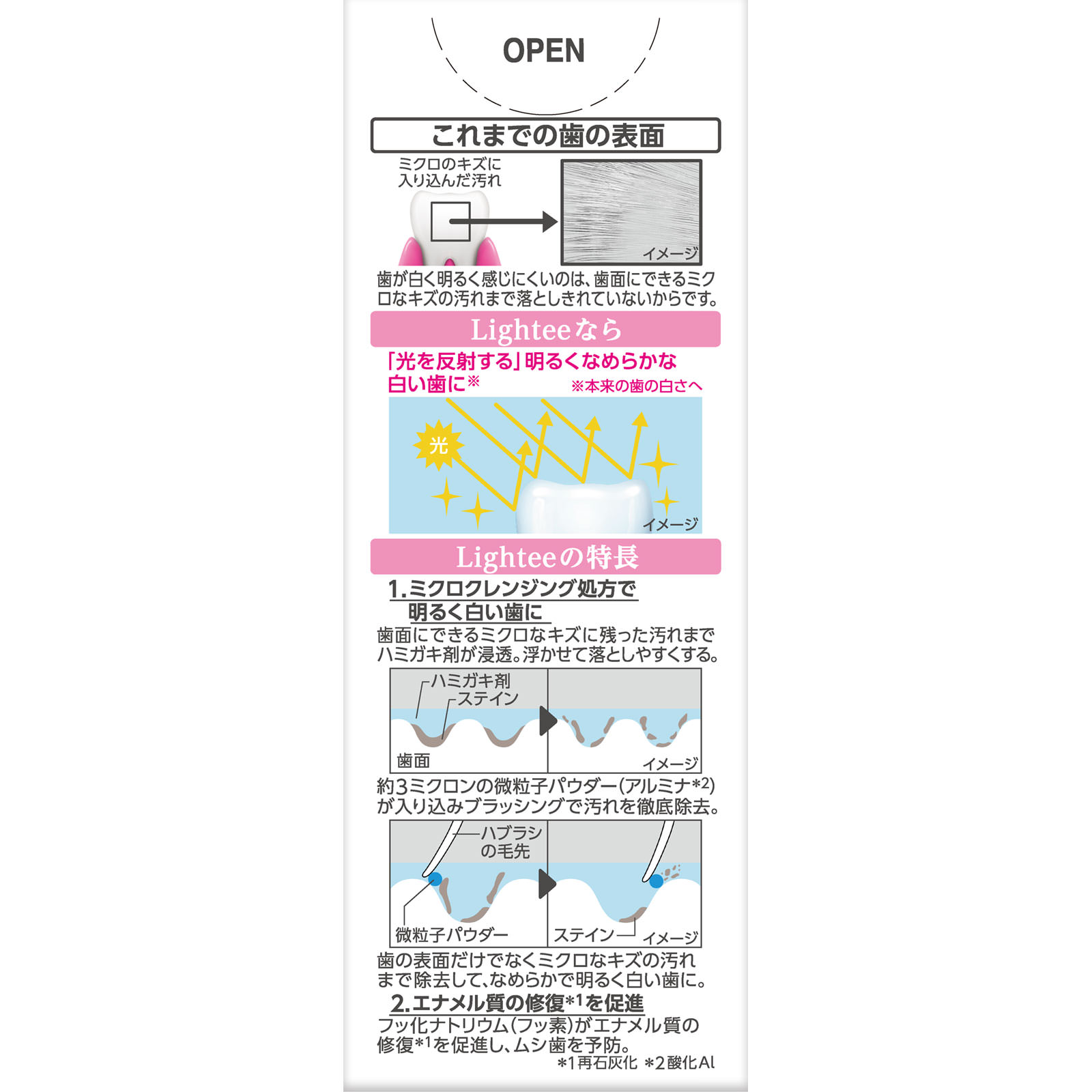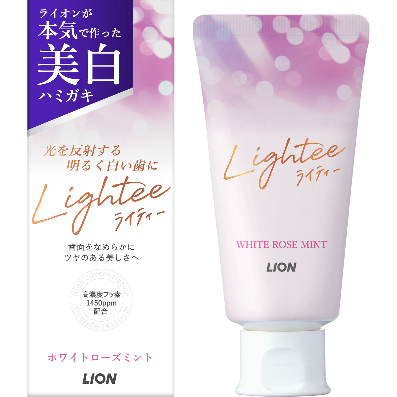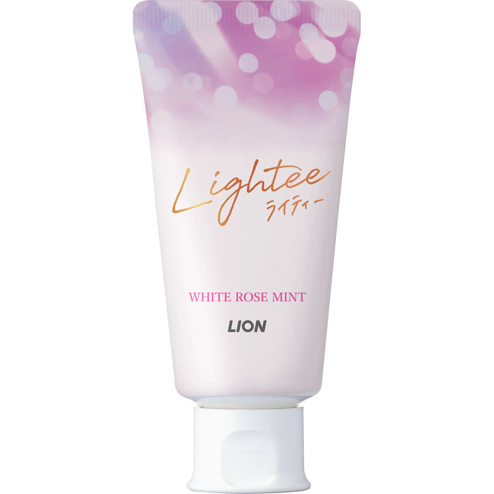 ライオンが本気で作った美白ハミガキ光を反射する明るく白い歯に歯面をなめらかにツヤのある美しさへ高濃度フッ素1450ppm配合爽やかで優雅なホワイトローズミント香味薬用ハミガキ歯が白く明るく感じにくいのは、歯面にできるミクロなキズの汚れまで落としきれていないからです。○Lighteeなら「光を反射する」明るくなめらかな白い歯に※※本来の歯の白さへ1.ミクロクレンジング処方で明るく白い歯に歯面にできるミクロなキズに残った汚れまでハミガキ剤が浸透。浮かせて落としやすくする。約3ミクロンの微粒子パウダー(アルミナ*2)が入り込みブラッシングで汚れを徹底除去。歯の表面だけでなくミクロなキズの汚れまで除去して、なめらかで明るく白い歯に。2.エナメル質の修復*1を促進フッ化ナトリウム(フッ素)がエナメル質の修復*1を促進し、ムシ歯を予防。*1 再石灰化*2 酸化Al