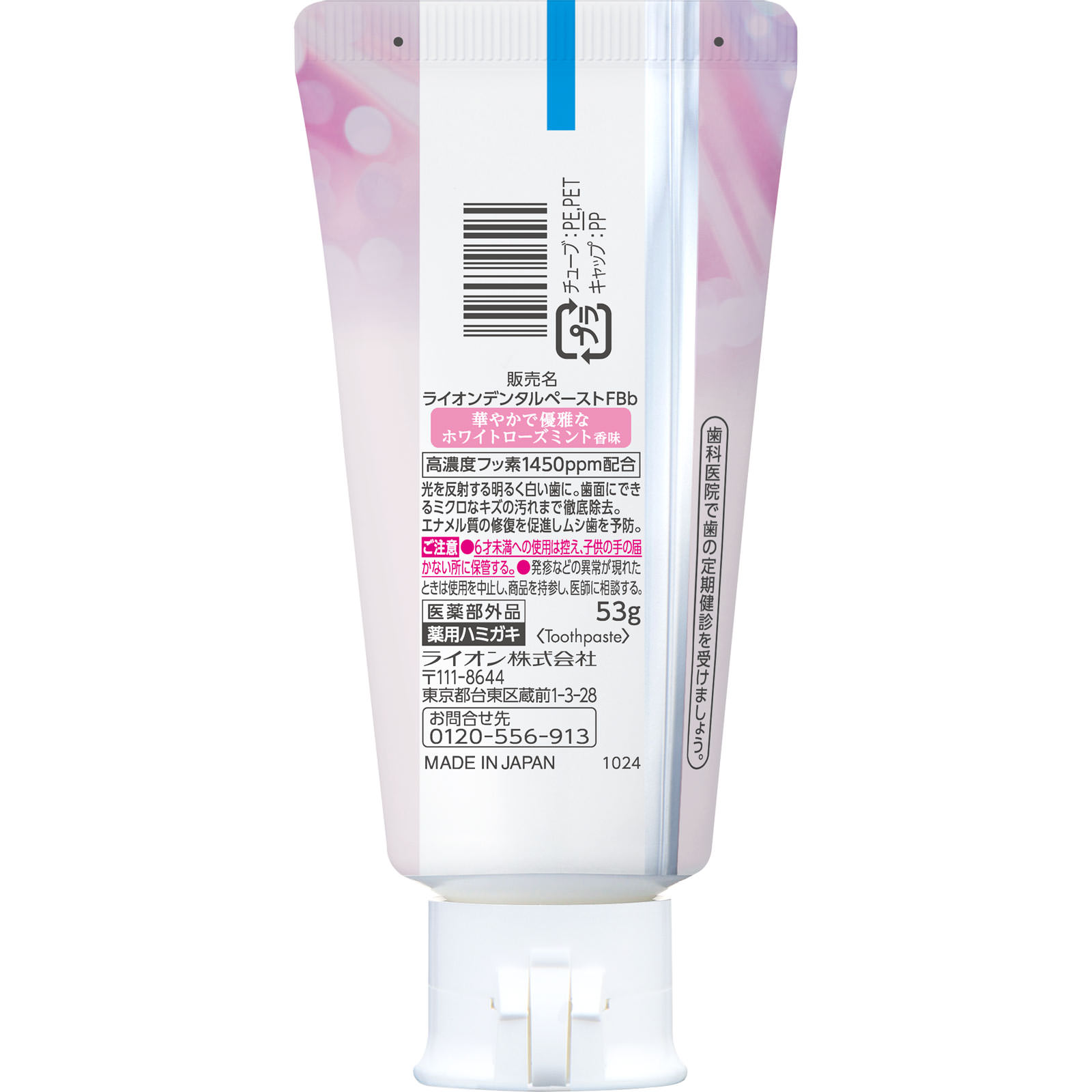 湿潤剤・・・ソルビット液、PG/清掃剤・・・無水ケイ酸A/薬用成分・・・PEG-8、無水ピロリン酸Na、フッ化ナトリウム(フッ素として1450ppm)、ラウロイルサルコシンNa/粘度調整剤・・・キサンタンガム、無水ケイ酸/発泡剤・・・ラウリル硫酸Na、POE硬化ヒマシ油/光沢剤・・・酸化Al/香味剤・・・香料(ホワイトローズミントタイプ)、サッカリンNa/安定剤・・・酸化Ti/清涼剤・・・メントール/洗浄剤・・・炭酸水素Na/粘結剤・・・ポリアクリル酸Na/pH調整剤・・・水酸化ナトリウム液/保存剤・・・パラベン