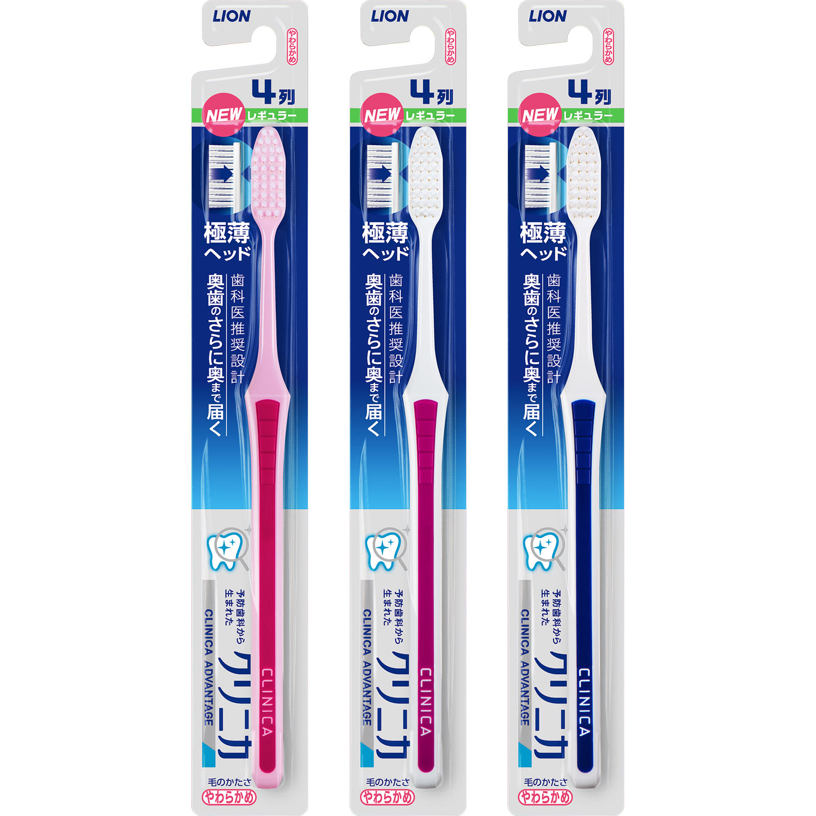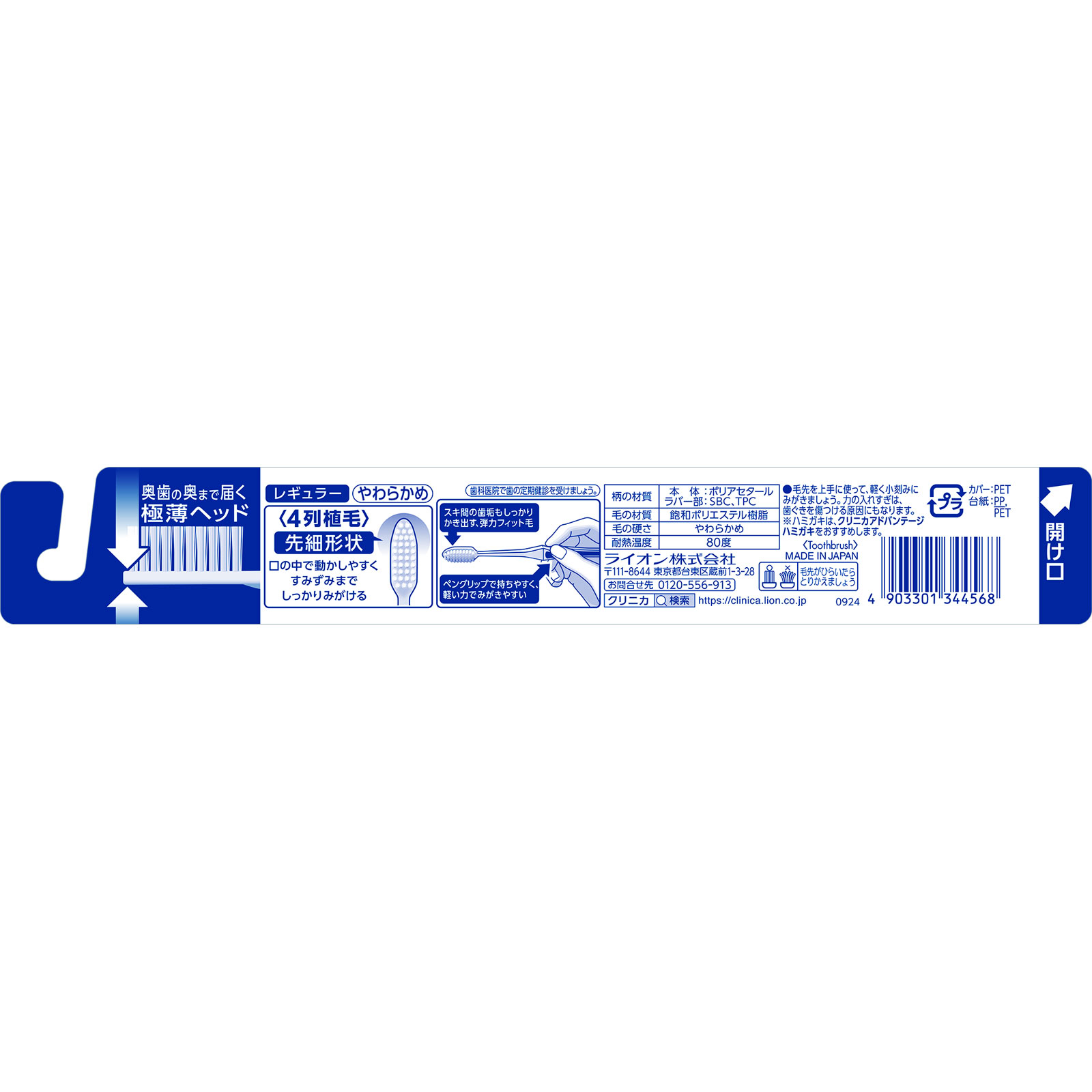 歯科医推奨設計 奥歯のさらに奥まで届く予防歯科から生まれたクリニカ奥歯の奥まで届く極薄ヘッド〈4列植毛〉先細形状口の中で動かしやすくすみずみまでしっかりみがけるスキ間の歯垢もしっかりかき出す、弾力フィット毛ペングリップで持ちやすく、軽い力でみがきやすい毛の硬さ:やわらかめ耐熱温度:80度