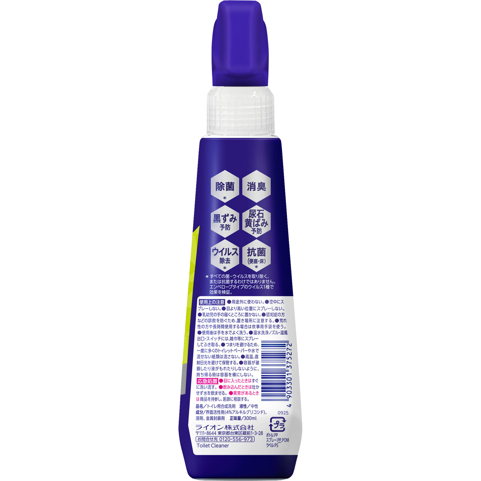 こすらずキレイ密着泡便器内+便座 床除菌* 消臭 黒ずみ予防 尿石黄ばみ予防 ウイルス除去* 抗菌(便座・床)**すべての菌・ウイルスを取り除く、または抗菌するわけではありません。エンベロープタイプのウイルス1種で効果を検証。60秒後に流すだけ!逆さでもスプレーできますレバーをプッシュ~と最後までゆっくり引くと、モコモコ泡が発生。フチ裏や便座フタの垂直面でも垂れずに、留まる!便座や床にも使えますレバーをシュッと素早く引くと、ゆるい泡になるので、床もふき取りやすい。