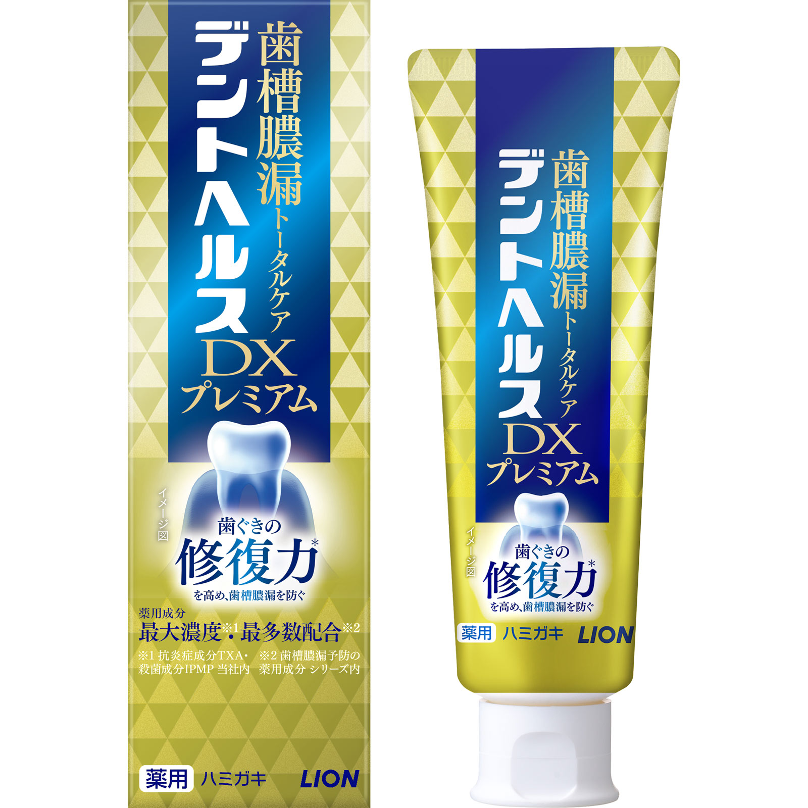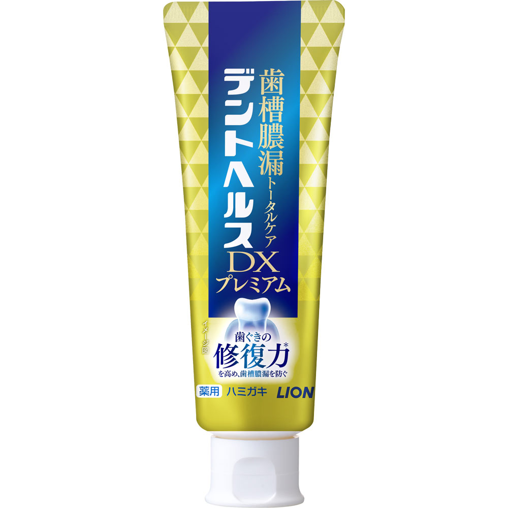 歯槽膿漏トータルケア歯ぐきの修復力*を高め、歯槽膿漏を防ぐ薬用成分最大濃度※1・最多数配合※2※1 抗炎症成分TXA・殺菌成分IPMP 当社内※2 歯槽膿漏予防の薬用成分 シリーズ内○11の効能で歯ぐきと歯をトータルケア・歯槽膿漏予防・知覚過敏症状予防・タバコのヤニ除去・歯肉炎予防・ムシ歯予防・口中浄化・出血予防・口臭防止・口中爽快・歯石沈着防止・歯を白くする*薬用成分ビタミンEが、歯ぐき細胞を活性化し、組織を修復○歯ぐきの修復力*を高め、歯槽膿漏予防歯槽膿漏予防成分をシリーズ内最多数配合〔ビタミンE〕歯ぐき細胞を活性化し、組織修復〔塩化Na〕歯ぐきをひきしめる〔GK2〕歯ぐきの炎症の元になる老廃物の蓄積を抑え、炎症を抑制〔TXA〕歯ぐきの腫れ・出血を抑制すっきりとした塩味 ひきしめ成分(塩化Na)配合ペースト(白)高濃度フッ素1450ppm配合