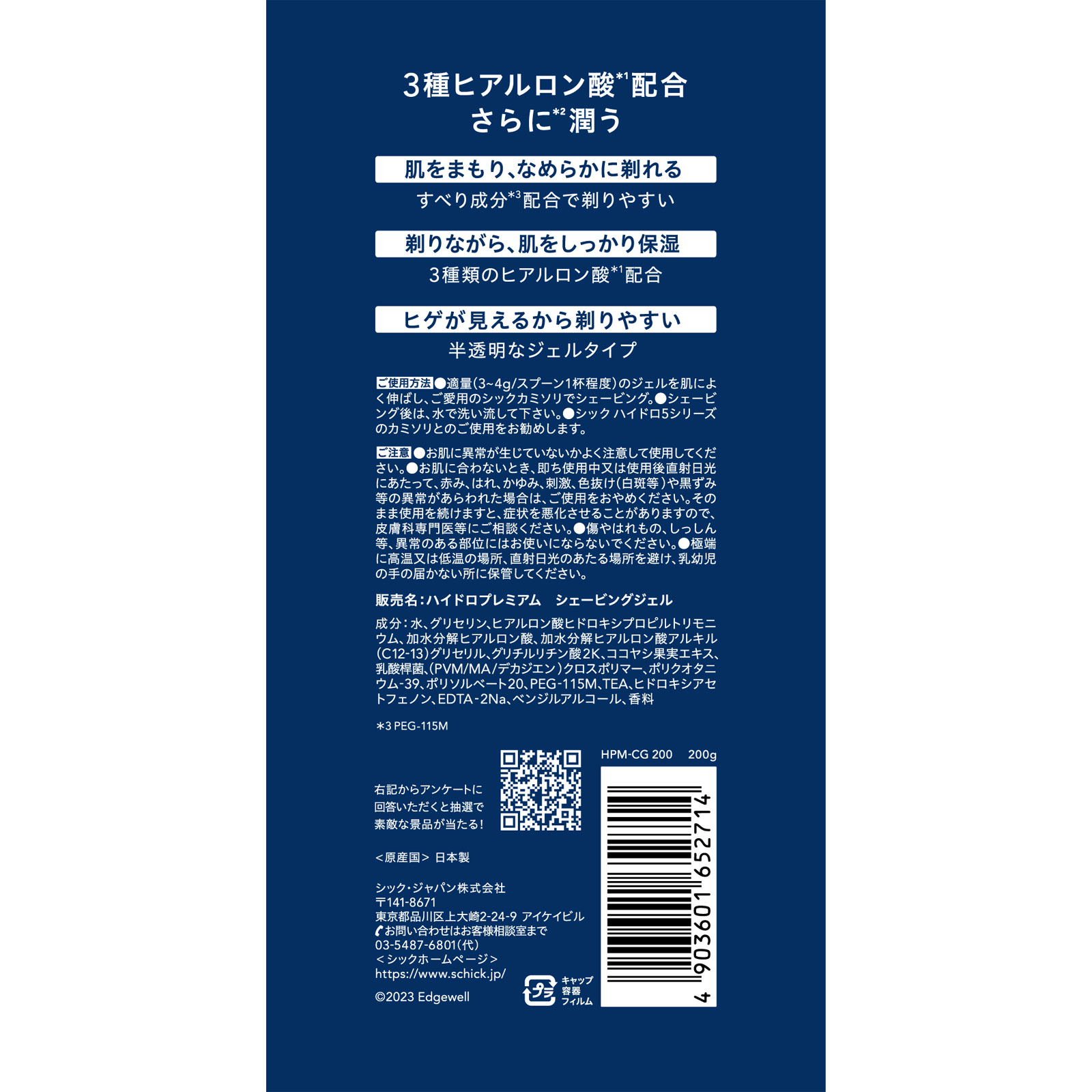 潤いながらひげを柔らかく刃すべりなめらか日本市場No.1*メーカー*インテージ・SRI+調べ(2022年8月~2023年7月)カミソリ市場(ホルダー、ディスポーザブル、替刃)累計販売金額つるり肌3種のヒアルロン酸*1配合さらに*2潤う剃りやすい透明ジェル*1 保湿剤:ヒアルロン酸ヒドロキシプロピルトリモニウム、加水分解ヒアルロン酸、加水分解ヒアルロン酸アルキル(C12-13)グリセリル*2 弊社従来品(シック ハイドロ シェービングジェルP)との比較[肌をまもり、なめらかに剃れる]すべり成分*3配合で剃りやすい[剃りながら、肌をしっかり保湿]3種類のヒアルロン酸*1配合[ヒゲが見えるから剃りやすい]半透明なジェルタイプ*3 PEG-115M