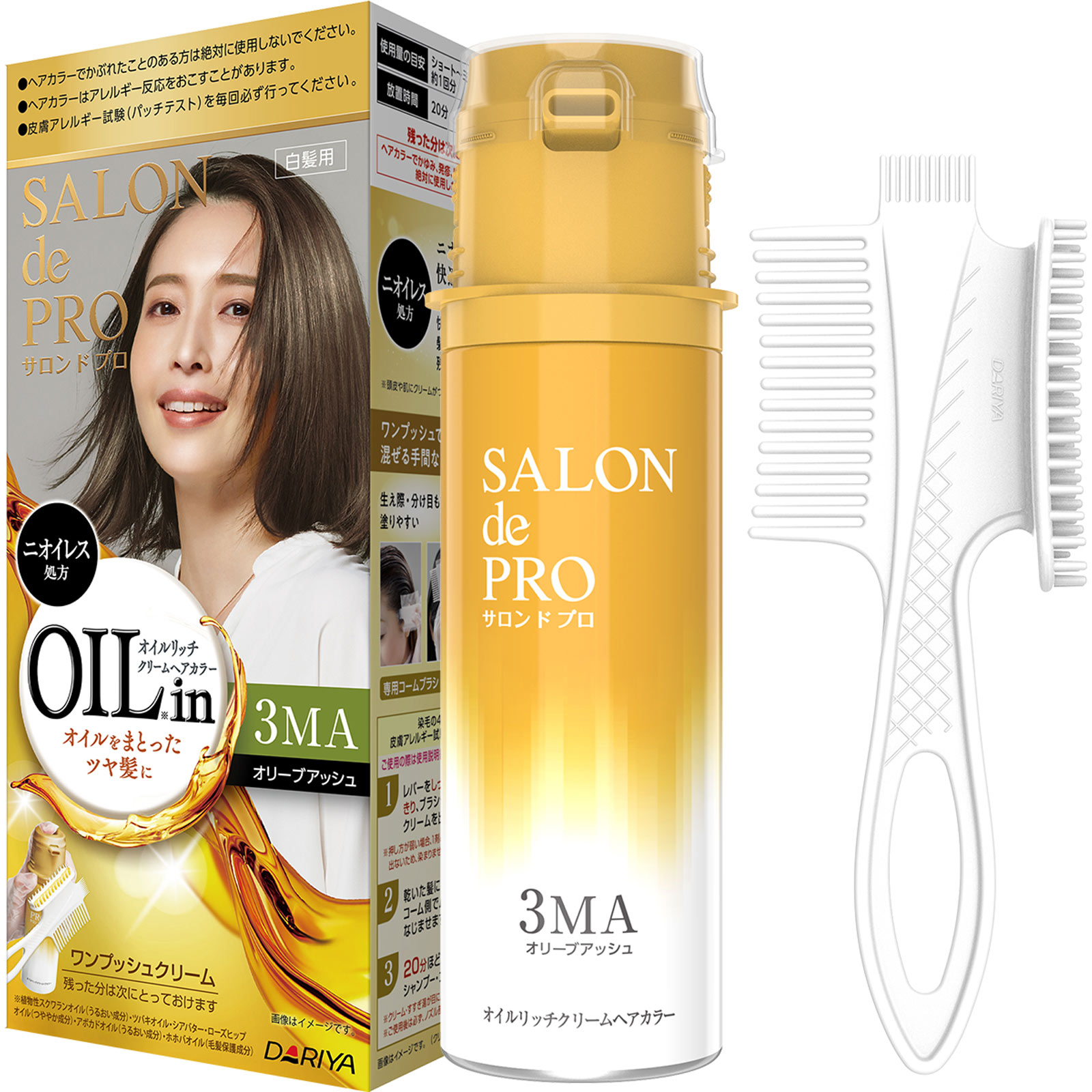 オイルをまとったツヤ髪にワンプッシュクリーム赤味を抑えた明るいアッシュ放置時間:20分残った分は次にとっておけます。ニオイレス処方で快適に染められるイヤなニオイがしないから快適な使い心地。染めた後も髪にヘアカラーのニオイが残りません。※頭皮や肌にクリームがついた場合、反応臭がすることがあります。生え際・分け目も簡単 塗りやすい専用コームブラシ 手袋付きオイルリッチなクリームがヴェールのように髪を包み込み上質でツヤのある仕上がりに○オイルヴェール技術植物性スクワランオイル※1に加え5種のオイル※2を独自のブレンドで配合。ヴェールのように髪を包み込みツヤのある指通りの良い髪へ。※1 うるおい成分※2 ツバキオイル・シアバター・ローズヒップオイル(つややか成分)・アボカドオイル(うるおい成分)・ホホバオイル(毛髪保護成分)○立体カラーバランスメインカラー 補正カラー 深みカラー美しい色を引き立てる染料バランスで深みのある色に染め上げる。色持ち成分:シルクハイブリッドポリマー(プロテシルLH)※3配合※3 (加水分解シルク/PG-プロピルメチルシランジオール)クロスポリマー