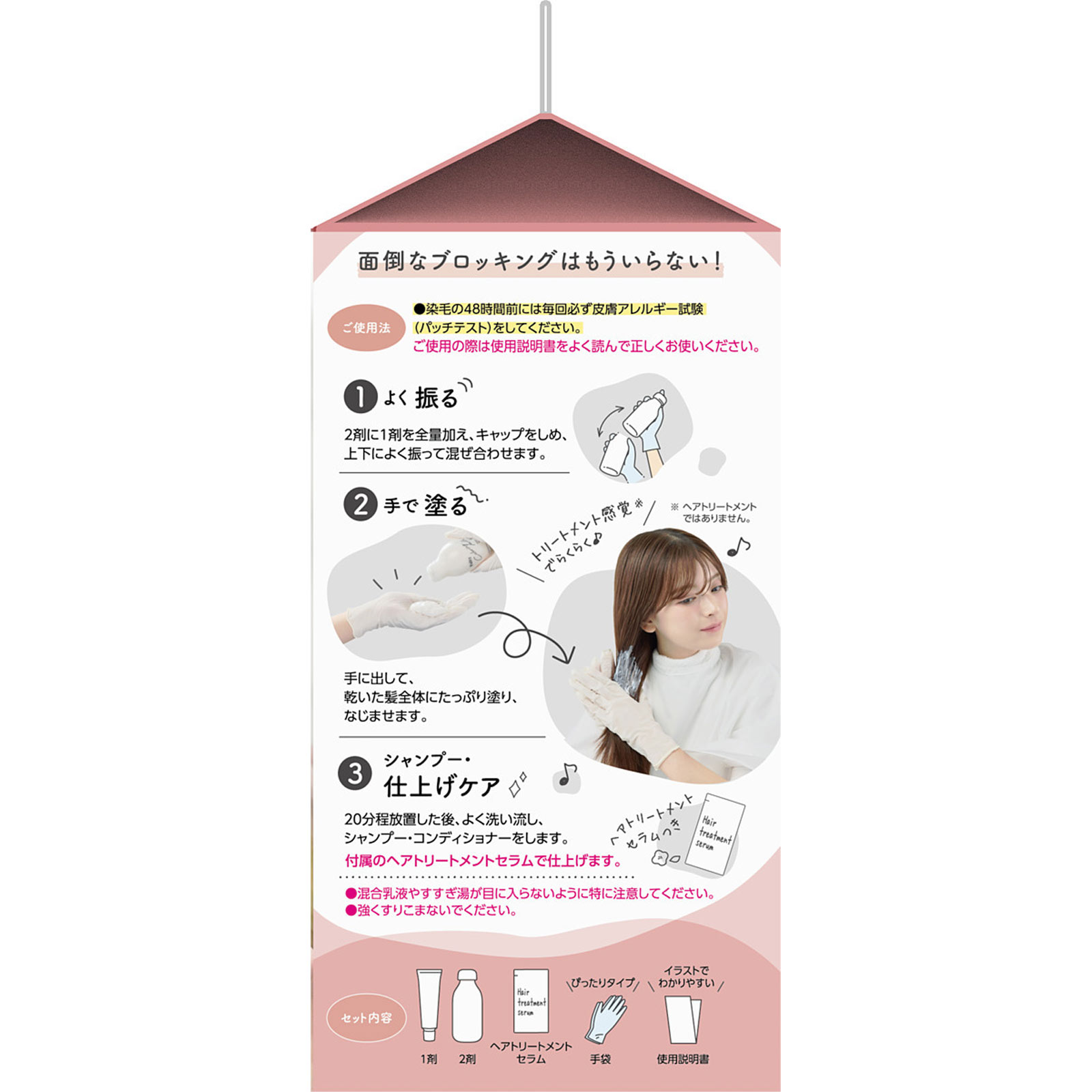 たっぷり塗れてムラなく染めるたれずに密着乳液手で簡単 うしろも塗りやすいキレイな髪色の秘密は・・・手だけで簡単に塗れる 密着乳液だからムラなくキレイ黒髪用かわいいとポジティブを詰め込んだコーラル系ピンク※1明るさレベル4●明るい髪に使用した場合の明るさです。※1 本音ピンクのイメージ表現です。5つのトリートメント成分配合!色持ち成分 シルクプロテインつややか成分 アーモンドオイル、グレープシードオイル※2うるおい成分 フルーツエキス※3 トリプルタンパク※4※2 ブドウ種子油※3 オレンジ果汁、リンゴ果汁、モモ果汁、レモン果汁※4 パールタンパク(加水分解コンキオリン液)、コラーゲンタンパク、ローヤルゼリータンパク面倒なブロッキングはもういらない!