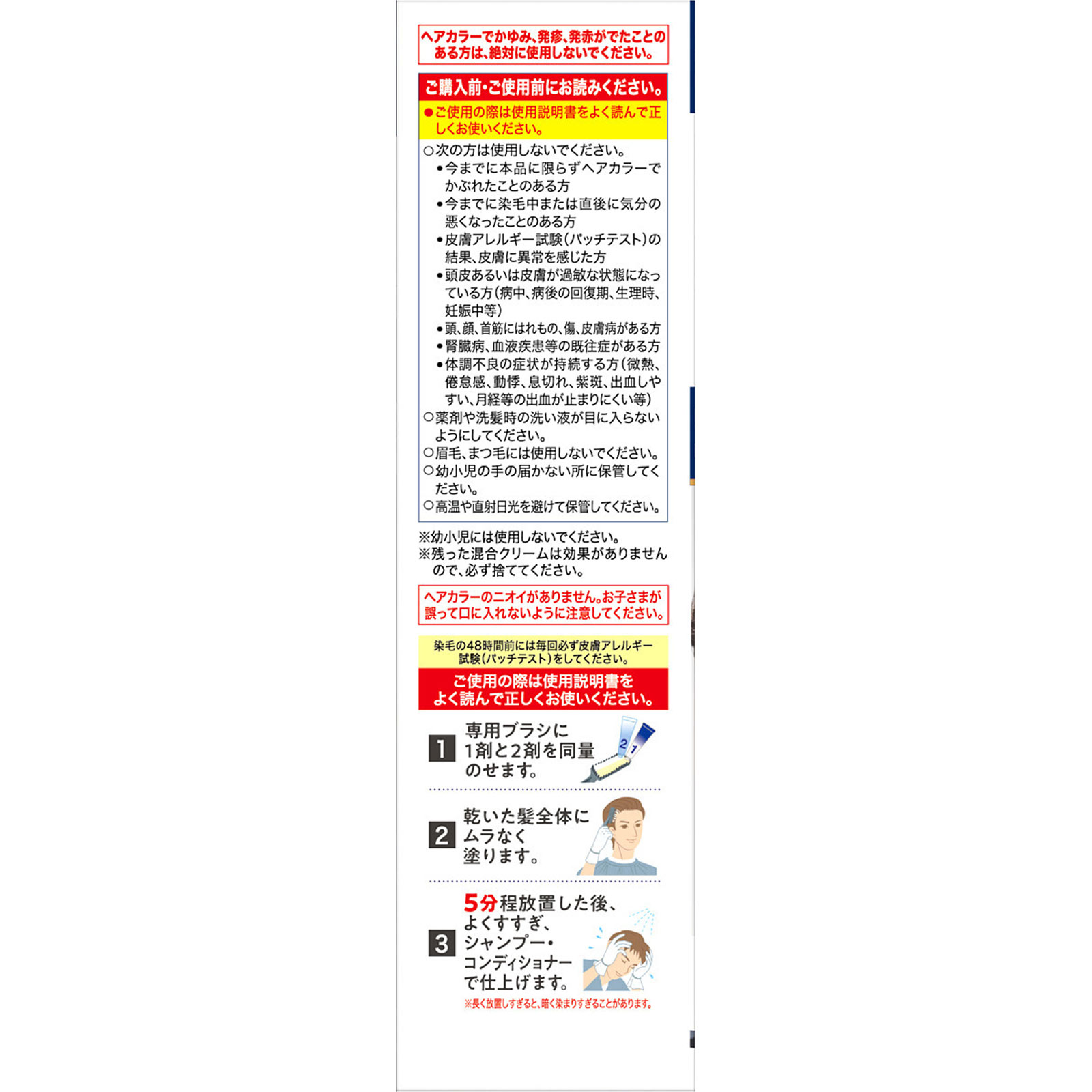 ニオイのない白髪染めムラなくきちんと染める自然な仕上がりブラシで簡単クリームタイプニオわずしっかり染める自分も周りも快適なヘアカラー色落ちしても赤っぽくなりにくい○サッと簡単きちんと塗れる・アーチ型ブラシが頭にフィット○細部までしっかり・もみあげ・生え際も塗りやすい細部用クシつき○W色持ち成分配合シルクプロテイン シルクハイブリッドポリマー※※(加水分解シルク/PG-プロピルメチルシランジオール)クロスポリマー○3つのトリートメント成分配合・うるおい成分ローヤルゼリーエキス・つややか成分アンズエキス・毛髪保護成分海藻エキス放置時間:5分残った分は、次に取っておけます。中味が出しきりやすいアルミチューブ