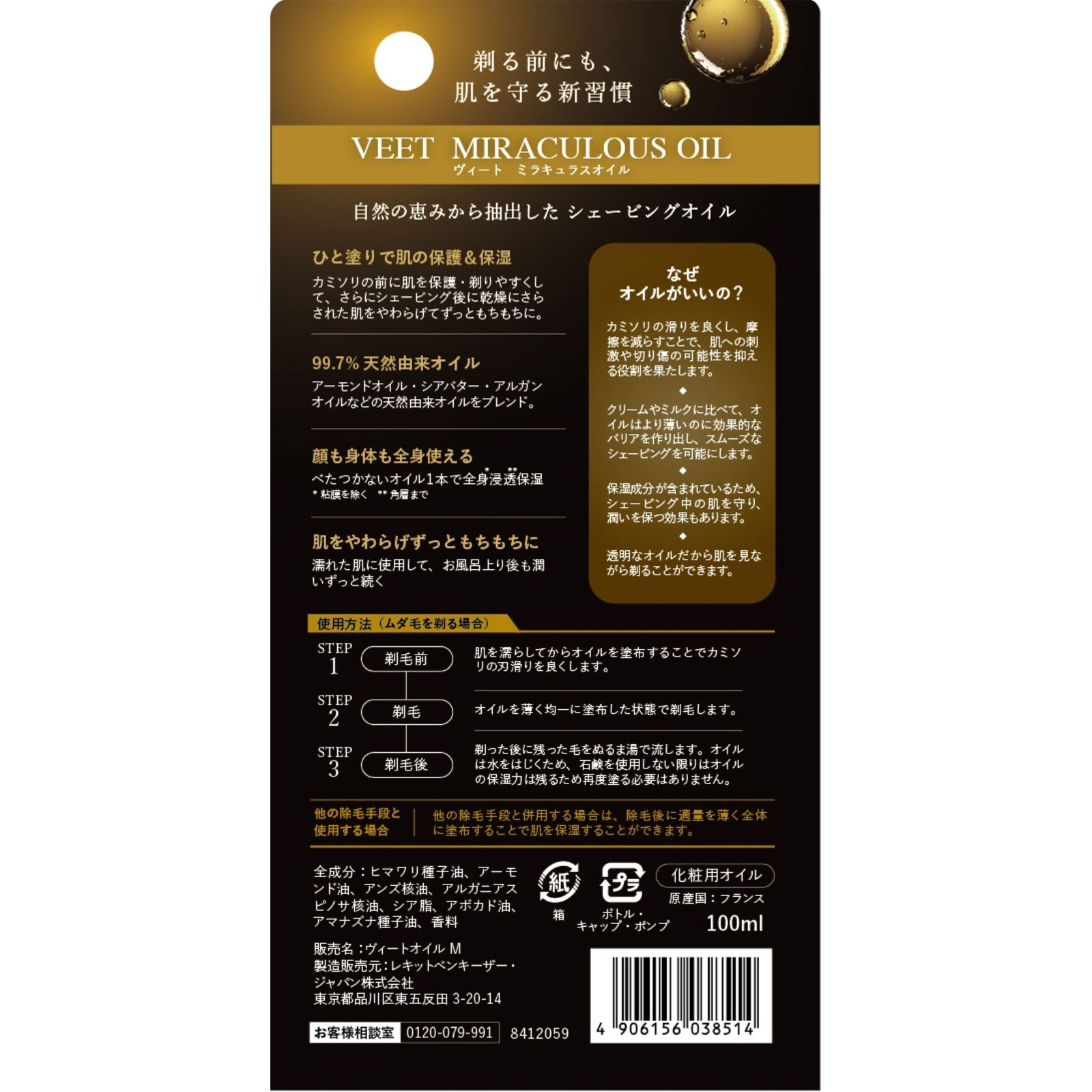 世界で*1日本で*2売り上げNo.1 除脱毛ブランド自然の恵みから抽出したシェービングオイル99.7%天然由来オイル顔も身体も全身使えるひと塗りで肌の保護&保湿肌を柔らげずっともちもちに*1 世界ムダ毛処理剤市場2023年2月~2024年1月ニールセン調べ*2 インテージSRI+「係脱毛市場」2023年1月~2023年12月 ブランド別累計販売金額剃る前にも、肌を守る新習慣自然の恵みから抽出したシェービングオイル○ひと塗りで肌の保護&保湿カミソリの前に肌を保護・剃りやすくして、さらにシェービング後に乾燥にさらされた肌をやわらげてずっともちもちに。○99.7% 天然由来オイルアーモンドオイル・シアバター・アルガンオイルなどの天然由来オイルをブレンド。○顔も身体も全身使えるべたつかないオイル1本で全身*浸透**保湿*粘膜を除く**角層まで○肌をやわらげずっともちもちに濡れた肌に使用して、お風呂上り後も潤いずっと続く○なぜオイルがいいの?カミソリの滑りを良くし、摩擦を減らすことで、肌への刺激や切り傷の可能性を抑える役割を果たします。クリームやミルクに比べて、オイルはより薄いのに効果的なバリアを作り出し、スムーズなシェービングを可能にします。保湿成分が含まれているため、シェービング中の肌を守り、潤いを保つ効果もあります。透明なオイルだから肌を見ながら剃ることができます。○他の除毛手段と使用する場合他の除毛手段と併用する場合は、除毛後に適量を薄く全体に塗布することで肌を保湿することができます。