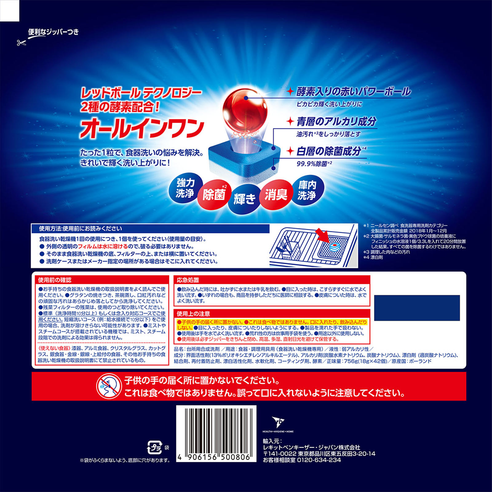便利なジッパーつき世界No.1シェアブランド*1強力洗浄 消臭 庫内洗浄 輝きポンと置くだけ食洗機専用タブレット洗剤フレッシュレモンの香りレッドボールテクノロジー2種の酵素配合!オールインワンたった1粒で、食器洗いの悩みを解決。きれいで輝く洗い上がりに!○酵素入りの赤いパワーボール ピカピカ輝く洗い上がりに○青層のアルカリ成分 油汚れ*3をしっかり落とす○白層の除菌成分*4 99.9%除菌*2*1 ニールセン調べ 食洗器専用洗剤カテゴリー 全製品累計販売金額 2018年1月~12月*2 大腸菌・サルモネラ菌・黄色ブドウ球菌の培養液にフィニッシュの水溶液1個/3.3Lを入れて20分間放置した結果。すべての菌を除菌するわけではありません。*3 調理した肉などの汚れ*4 漂白剤