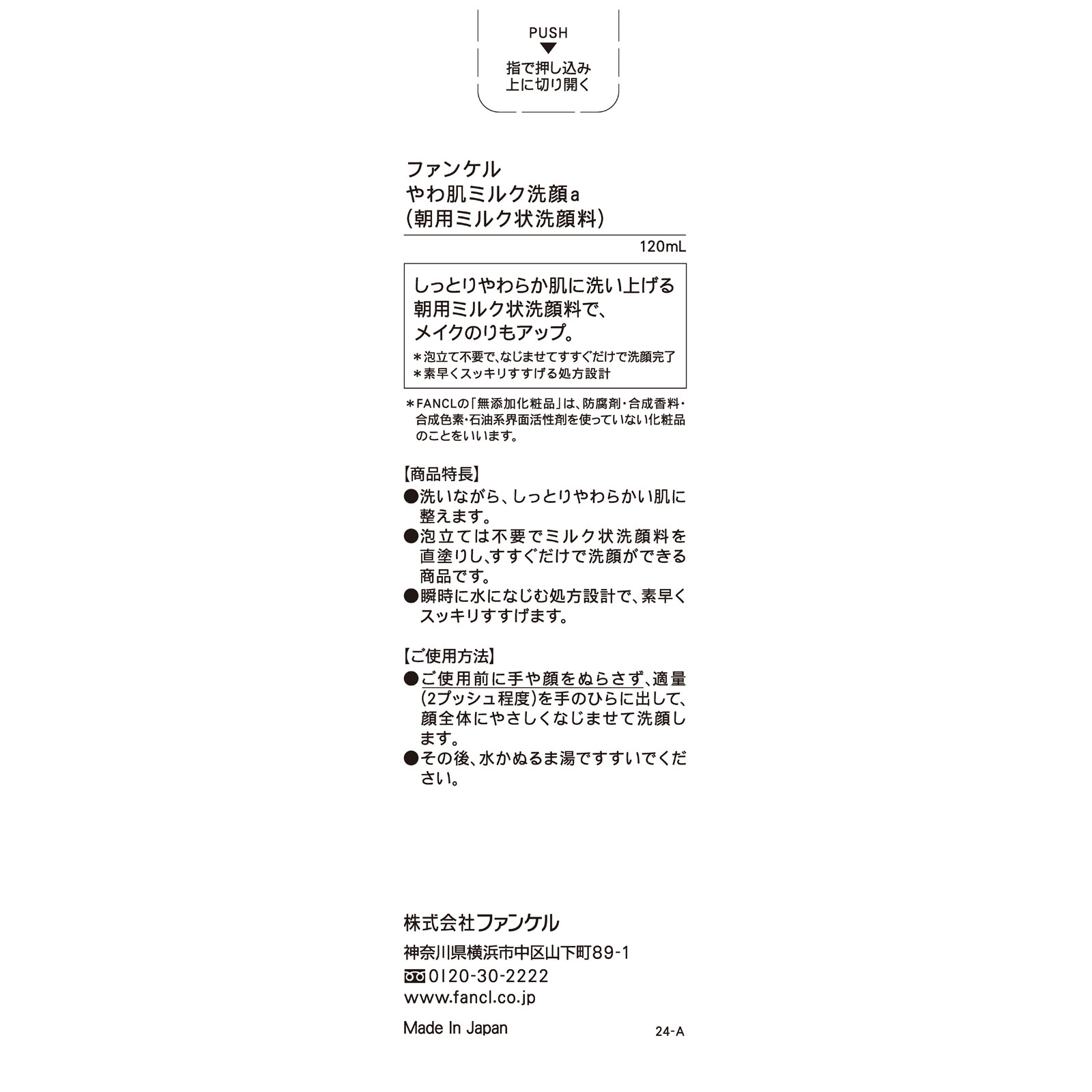 まるで洗う乳液。肌もちもち防腐剤無添加 合成香料不使用しっとりやわらか肌に洗い上げる朝用ミルク状洗顔料で、メイクのりもアップ。*泡立て不要で、なじませてすすぐだけで洗顔完了*素早くスッキリすすげる処方設計*FANCLの「無添加化粧品」は、防腐剤・合成香料・合成色素・石油系界面活性剤を使っていない化粧品のことをいいます。●洗いながら、しっとりやわらかい肌に整えます。●泡立ては不要でミルク状洗顔料を直塗りし、すすぐだけで洗顔ができる商品です。●瞬時に水になじむ処方設計で、素早くスッキリすすげます。