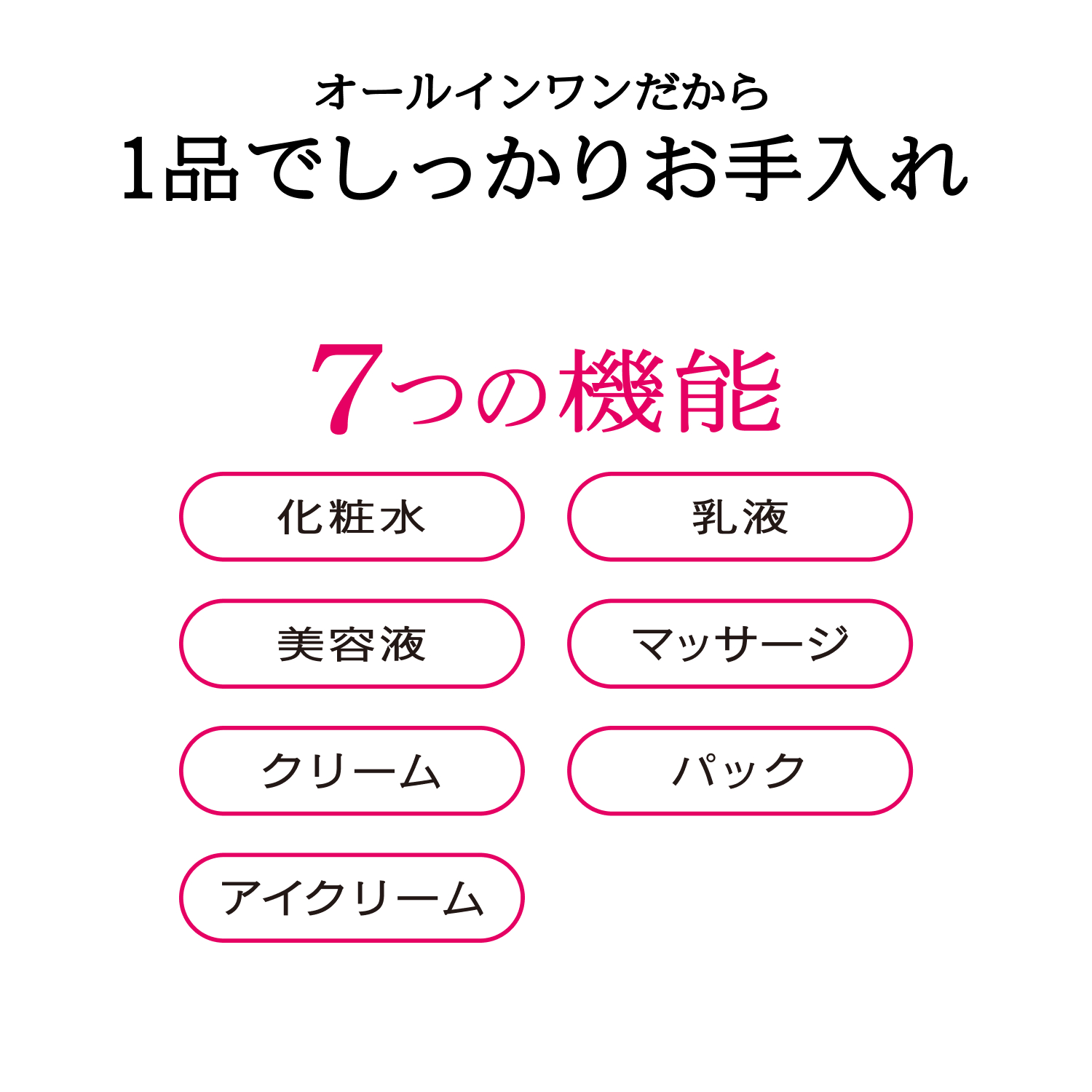 1品で本格シワ改善 大人のオールインワン7つの機能(化粧水・乳液・美容液・マッサージ・クリーム・アイクリーム・パック)がひとつになった大人のオールインワン。 輝くゲル状クリームが、使った瞬間になめらかに密着し、 つやっと輝く肌に導きます。 シワ改善&美白*有効成分ナイアシンアミド配合。 *美白とは、メラニンの生成を抑え、シミ・そばかすを防ぐこと