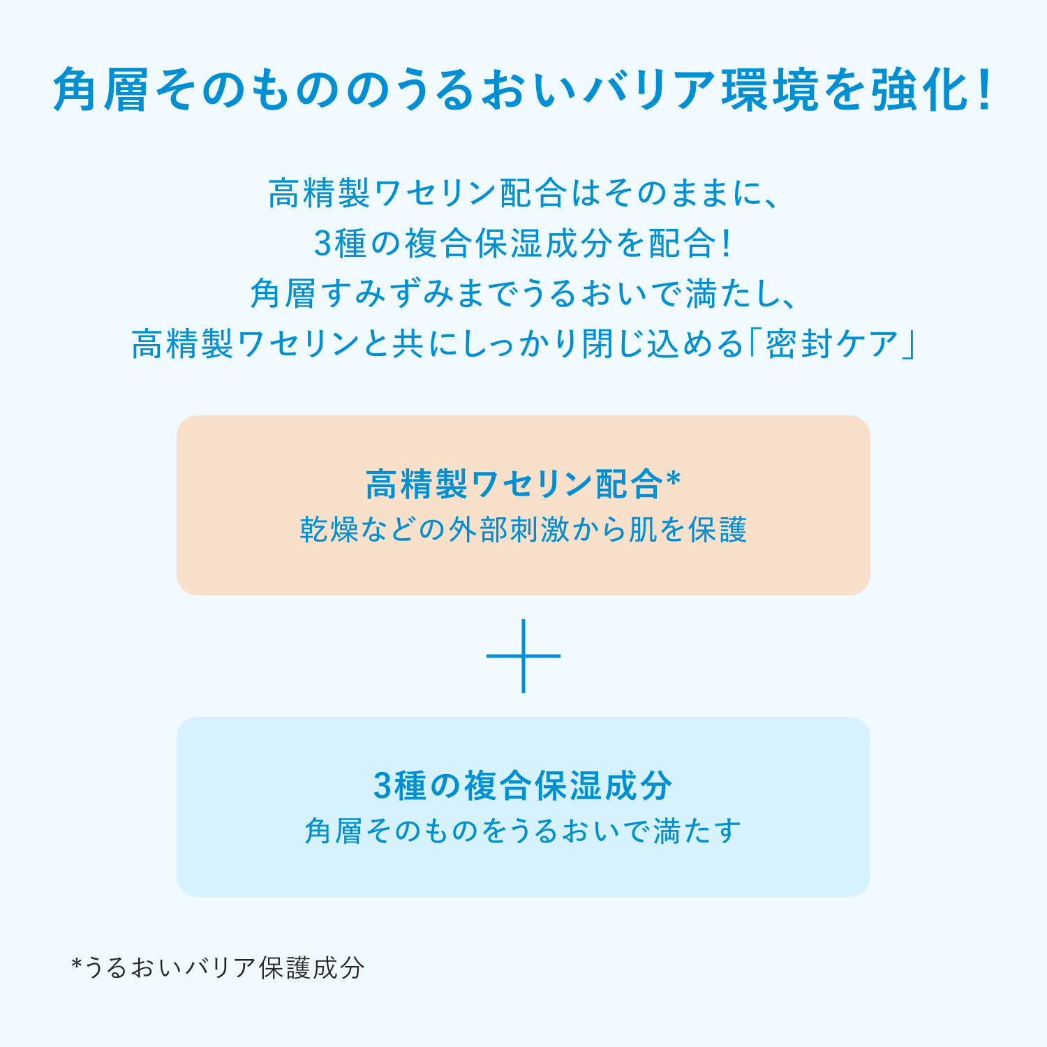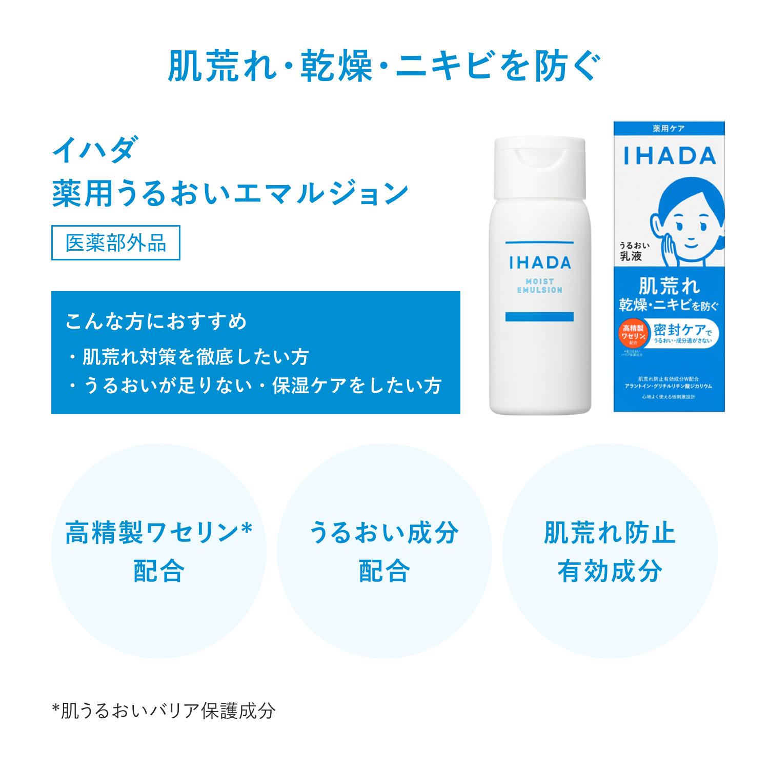 肌荒れを予防する薬用エマルジョン朝晩なじませるだけで肌荒れ・乾燥・ニキビを予防し繰り返しにくい肌へ。 薬用うるおいエマルジョン。 うるおいと成分を閉じ込める高精製ワセリン*配合。 Wの肌荒れ防止有効成分配合。 角層うるおいバリア処方で肌に素早くなじみ、やわらかですこやかな角層に。 *肌うるおいバリア保護成分 <肌が敏感な時も毎日使える処方設計> ○弱酸性 ○無香料 ○無着色 ○アルコール(エタノール)無添加 ○パラベン(防腐剤)無添加 ○厳選された原料を使用 〇ノンコメドジェニック・アレルギーテスト済み (全ての方にニキビができない、また、アレルギーが起きないわけではありません。)