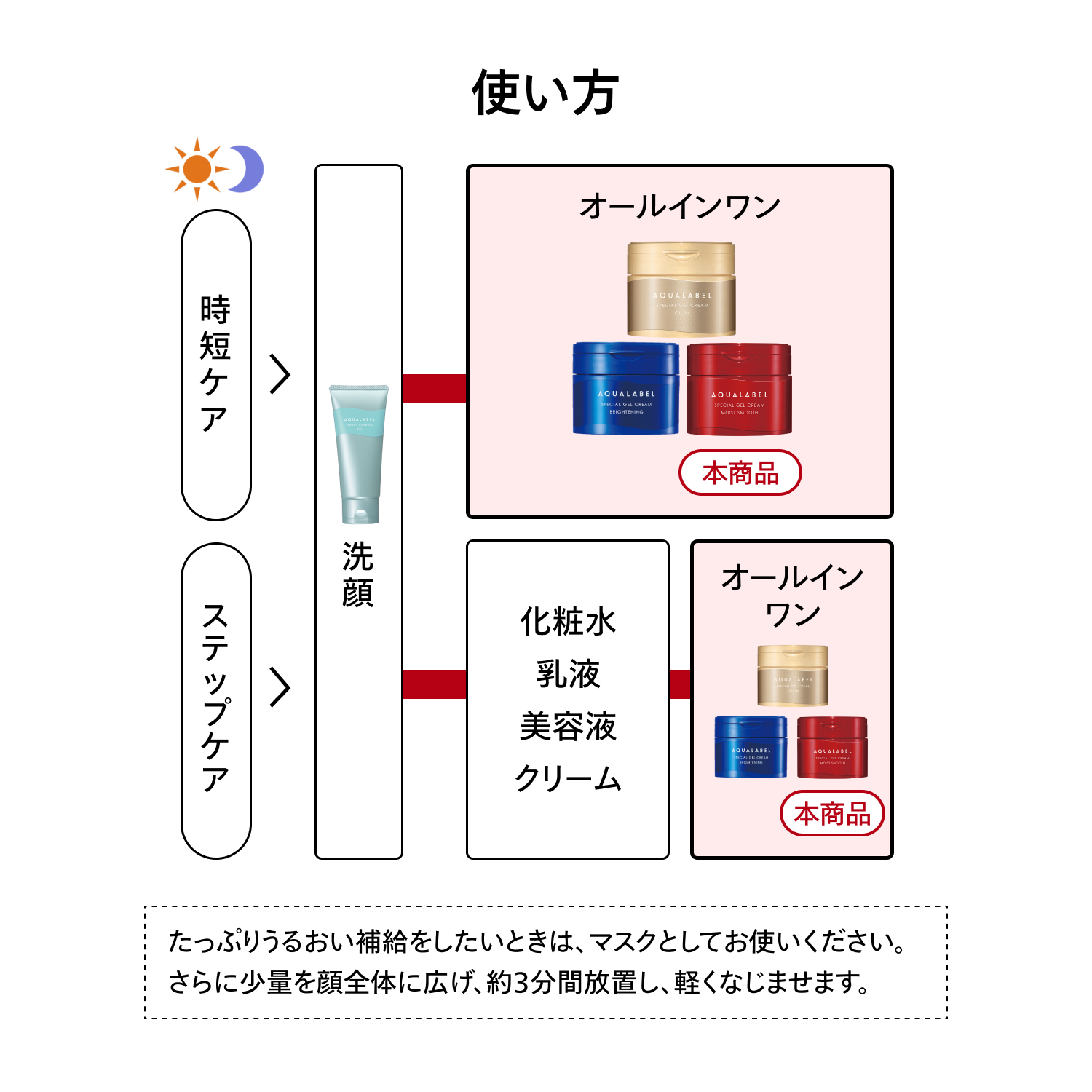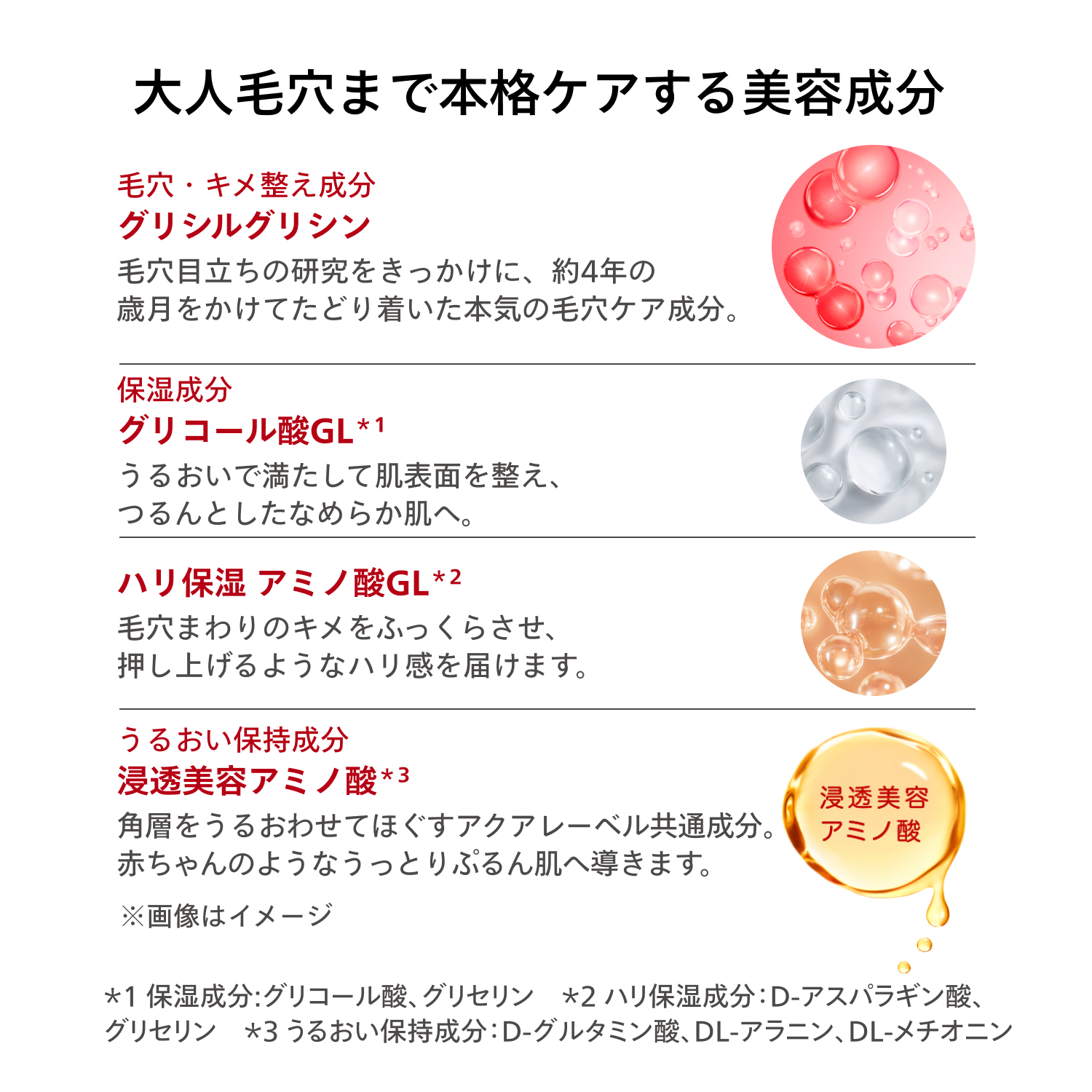 毛穴の目立ちに悩める大人の肌に、高保湿毛穴ケアオールインワン。 毛穴・キメ整え成分グリシルグリシン配合。 1品5機能(化粧水・乳液・美容液・クリーム・マスク)。 乾燥でごわつきがちな肌表面をうるおいでほぐし、角層深くまでじゅわ~っと美容成分を浸透。ふわっと密封し、うるおいを持続させます。