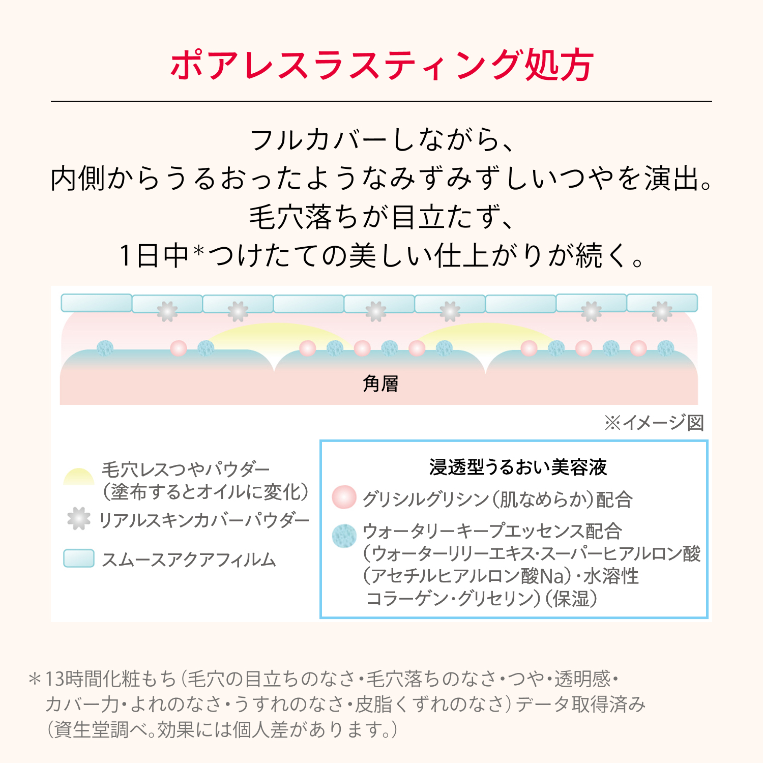 使うたび、白玉のようなワントーン明るい「極上つるん肌」へ。 薄膜で肌悩みをカバーし、軽やかな使い心地。 美容液でファンデ成分を包み込むから美容液が肌にずっとふれる独自技術(セラムファースト技術)。 グルタチオン(整肌・保護)配合。 明るく輝き、自然な血色感のある肌色を叶えるブライトピーチパール配合。  13時間 化粧持ち*データ取得済み *毛穴の目立ちのなさ・毛穴落ちのなさ・つや・透明感・カバー力・よれのなさ・うすれのなさ・皮脂くずれのなさ(メーカー調べ。効果には個人差があります。)
