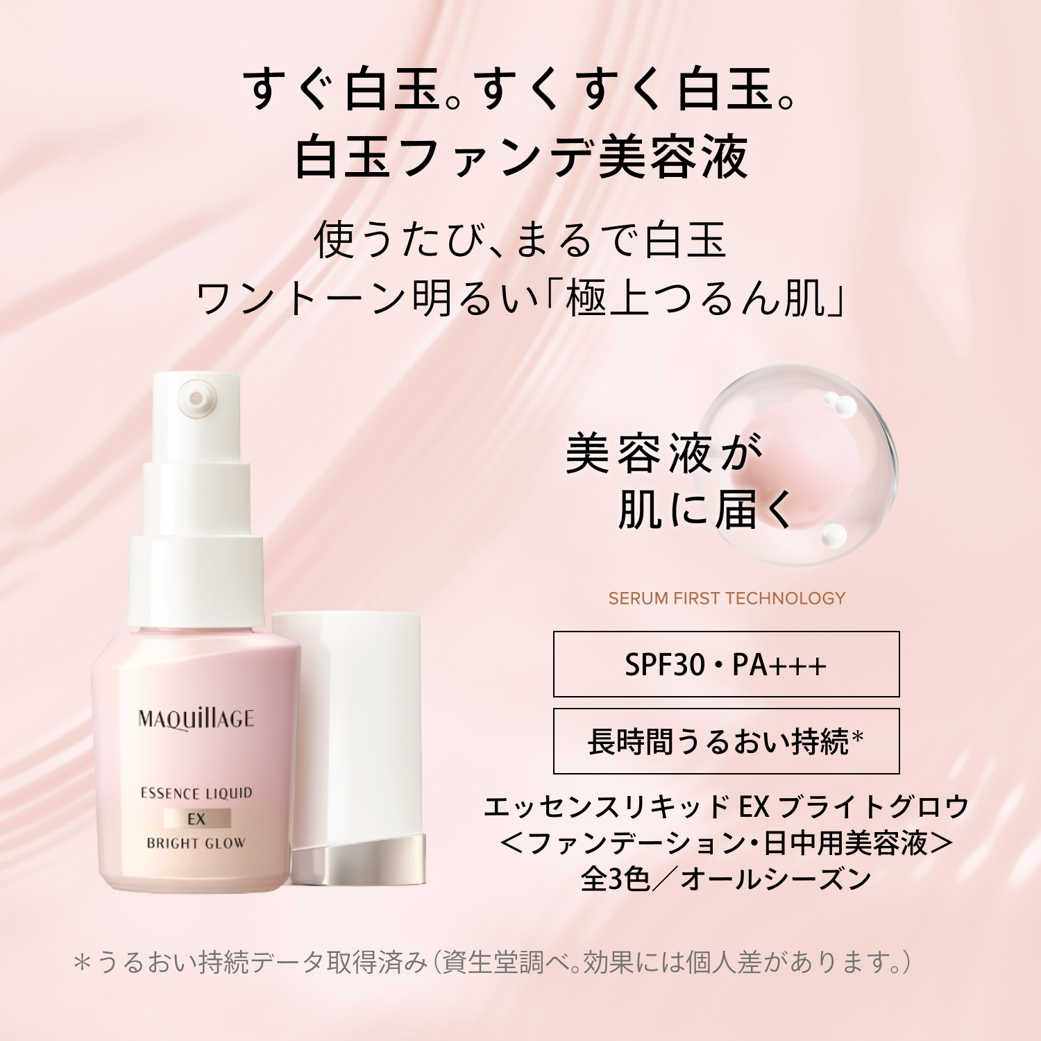 使うたび、白玉のようなワントーン明るい「極上つるん肌」へ。 薄膜で肌悩みをカバーし、軽やかな使い心地。 美容液でファンデ成分を包み込むから美容液が肌にずっとふれる独自技術(セラムファースト技術)。 グルタチオン(整肌・保護)配合。 明るく輝き、自然な血色感のある肌色を叶えるブライトピーチパール配合。  13時間 化粧持ち*データ取得済み *毛穴の目立ちのなさ・毛穴落ちのなさ・つや・透明感・カバー力・よれのなさ・うすれのなさ・皮脂くずれのなさ(メーカー調べ。効果には個人差があります。)