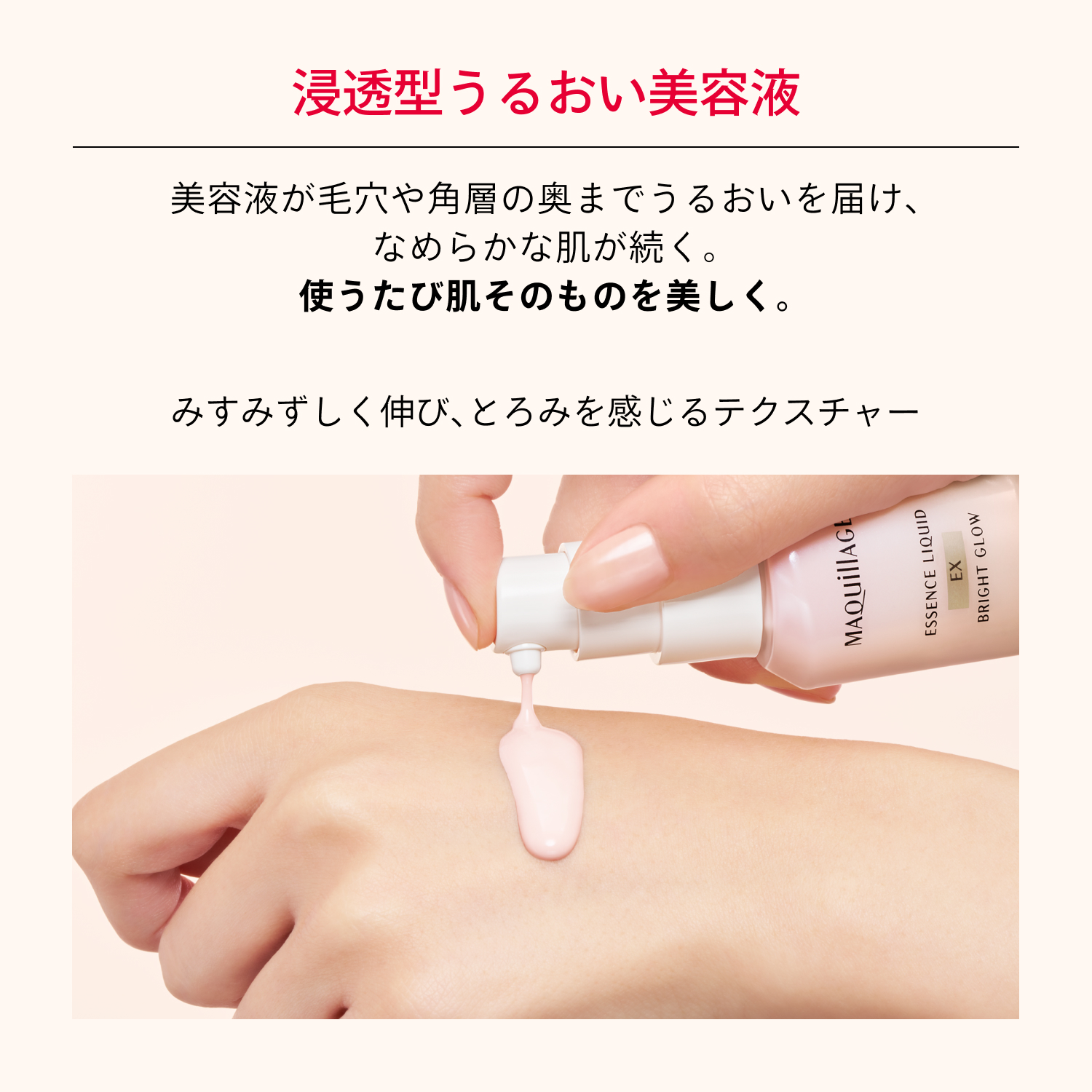 ◇中味が飛び散ることがありますので、手のひらにディスペンサーの先を近づけて、優しく押すようにお使いください。 ◇目に入らないよう注意し、入ったときはすぐに洗い流してください。  ◇ご使用後は容器の口もとをきれいに拭き、必ずカバーキャップをきちんと閉めてく ださい。 ◇中味の品質を保つため、マキアージュ エッセンスリキッド EX ブライトグロウのディスペンサー以外は使用しないでください。 ◇中味衛生上、使用期間中はディスペンサーを容器から取り外さないでください。また、 途中で開けると中味が出にくくなることがあります。 ◇衣服などについた場合は、すぐに洗剤でていねいに洗い流してください。 ◇ディスペンサーがスムーズに動かなくなったり、カバーキャップがきちんと閉まらなくなった場合は、新しい本体をお求めください。 ◇日のあたるところや高温・多湿のところに置かないでください。 ◇製品性質上、まれに透明の液体(エモリエント成分)が出ることがありますが、使用性や仕上がりに問題はありません。 ◇火気にご注意ください。 ※商品のSPF表示及びPA表示は、SPF試験法に定められている塗布量1c㎡あたり2mgを皮ふに塗布して測定した結果です。