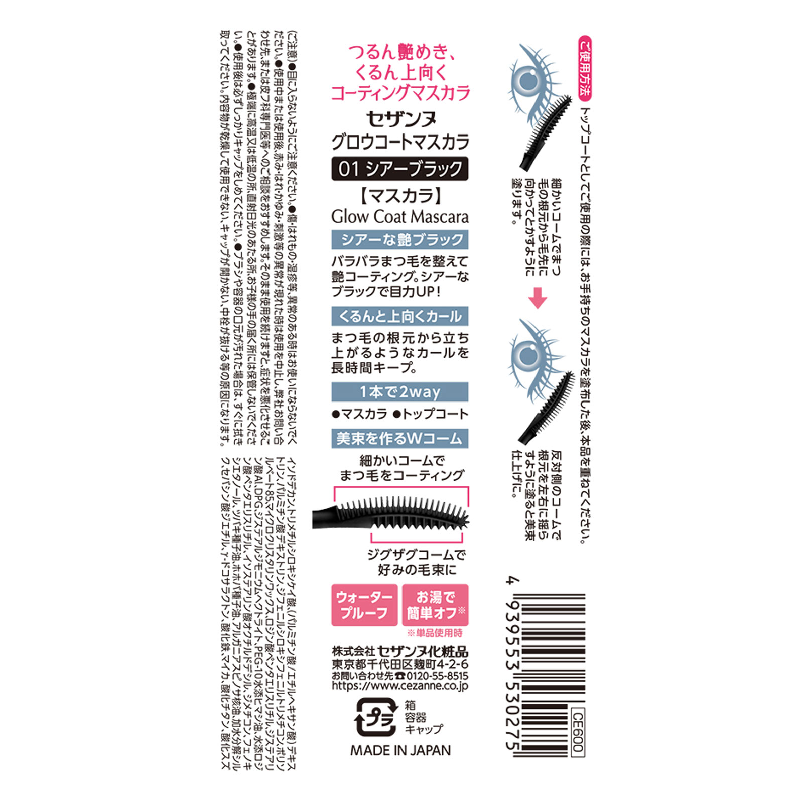 上向きカールキープトリートメント成分配合つるん艶めき、くるん上向くコーティングマスカラ[シアーな艶ブラック]バラバラまつ毛を整えて艶コーティング。シアーなブラックで目力UP![くるんと上向くカール]まつ毛の根元から立ち上がるようなカールを長時間キープ。[1本で2way]●マスカラ ●トップコート[美束を作るWコーム]細かいコームでまつ毛をコーティングジグザグコームで好みの毛束にウォータープルーフ お湯で簡単オフ※※単品使用時