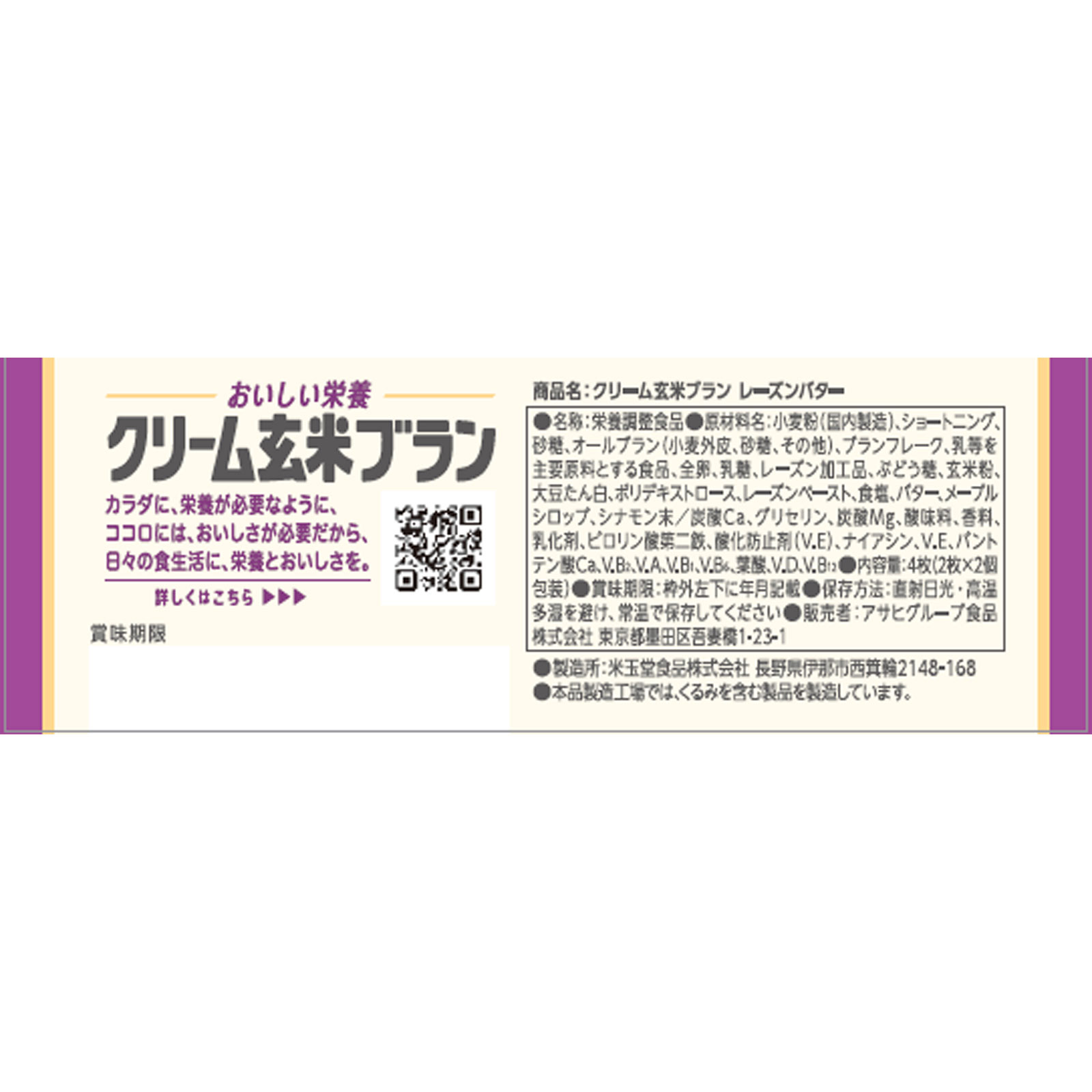 小麦粉(国内製造)、ショートニング、砂糖、オールブラン(小麦外皮、砂糖、その他)、ブランフレーク、乳等を主要原料とする食品、全卵、乳糖、レーズン加工品、ぶどう糖、玄米粉、大豆たん白、ポリデキストロース、レーズンペースト、食塩、バター、メープルシロップ、シナモン末/炭酸Ca、グリセリン、炭酸Mg、酸味料、香料、乳化剤、ピロリン酸第二鉄、酸化防止剤(V.E)、ナイアシン、V.E、パントテン酸Ca、V.B2、V.A、V.B1、V.B6、葉酸、V.D、V.B12