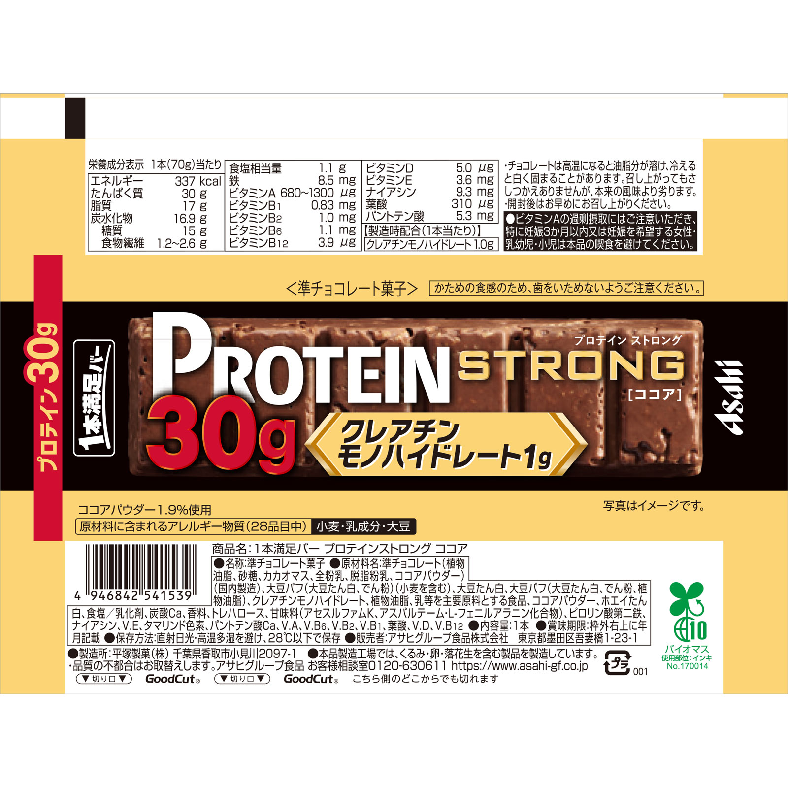 準チョコレート(植物油脂、砂糖、カカオマス、全粉乳、脱脂粉乳、ココアパウダー)(国内製造)、大豆パフ(大豆たん白、でん粉)(小麦を含む)、大豆たん白、大豆パフ(大豆たん白、でん粉、植物油脂)、クレアチンモノハイドレート、植物油脂、乳等を主要原料とする食品、ココアパウダー、ホエイたん白、食塩/乳化剤、炭酸Ca、香料、トレハロース、甘味料(アセスルファムK、アスパルテーム・L-フェニルアラニン化合物)、ピロリン酸第二鉄、ナイアシン、V.E、タマリンド色素、パントテン酸Ca、V.A、V.B6、V.B2、V.B1、葉酸、V.D、V.B12