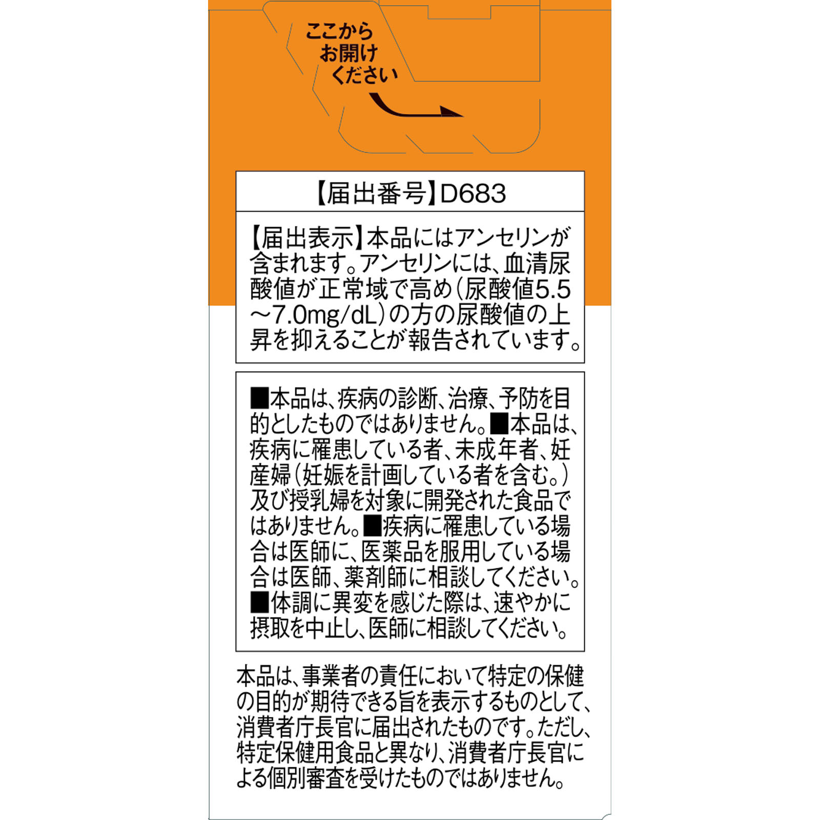 機能性関与成分アンセリン 50mg配合アンセリンが尿酸値が正常域で高めの方の尿酸値の上昇を抑える<届出表示>本品にはアンセリンが含まれます。アンセリンには、血清尿酸値が正常域で高め(尿酸値5.5~7.0mg/dL)の方の尿酸値の上昇を抑えることが報告されています。