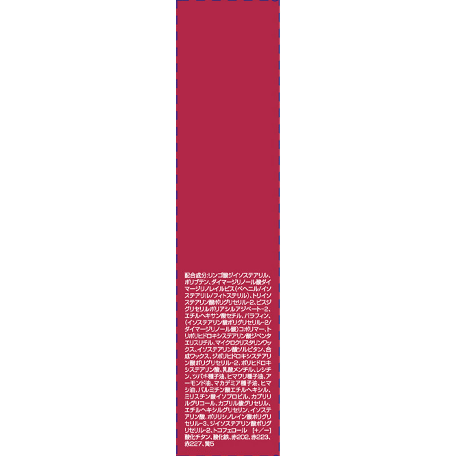リンゴ酸ジイソステアリル、ポリブテン、ダイマージリノール酸ダイマージリノレイルビス(ベヘニル/イソステアリル/フィトステリル)、トリイソステアリン酸ポリグリセリル-2、ビスジグリセリルポリアシルアジペート-2、エチルヘキサン酸セチル、パラフィン、(イソステアリン酸ポリグリセリル-2/ダイマージリノール酸)コポリマー、トリポリヒドロキシステアリン酸ジペンタエリスリチル、マイクロクリスタリンワックス、イソステアリン酸ソルビタン、合成ワックス、ジポリヒドロキシステアリン酸ポリグリセリル-2、ポリヒドロキシステアリン酸、乳酸メンチル、レシチン、ツバキ種子油、ヒマワリ種子油、アーモンド油、マカデミア種子油、ヒマシ油、パルミチン酸エチルヘキシル、ミリスチン酸イソプロピル、カプリリルグリコール、カプリル酸グリセリル、エチルヘキシルグリセリン、イソステアリン酸、ポリリシノレイン酸ポリグリセリル-3、ジイソステアリン酸ポリグリセリル-2、トコフェロール[+/-]酸化チタン、酸化鉄、赤202、赤223、赤227、黄5